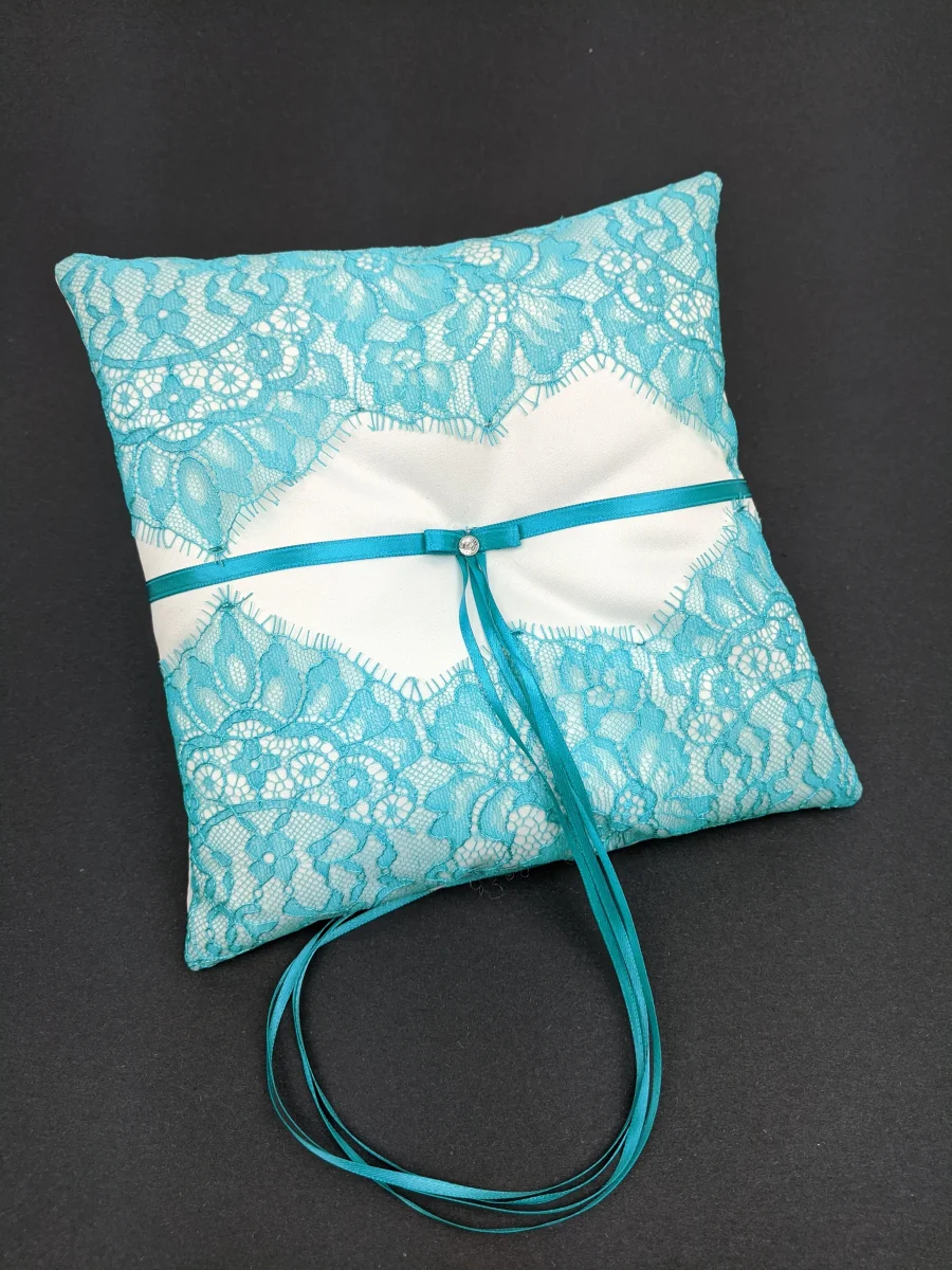 Soyez le premier à laisser votre avis sur “028A Coussin d’alliances blanc avec dentelle turquoise”