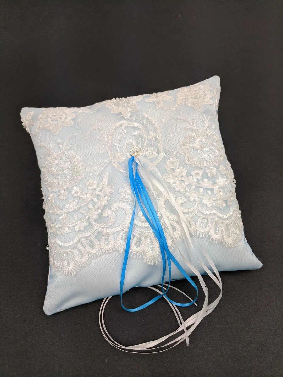 Coussin d’alliances en tulle bleu pâle, avec dentelle blanche et ruban blanc et bleu ciel pour y attacher les alliances.