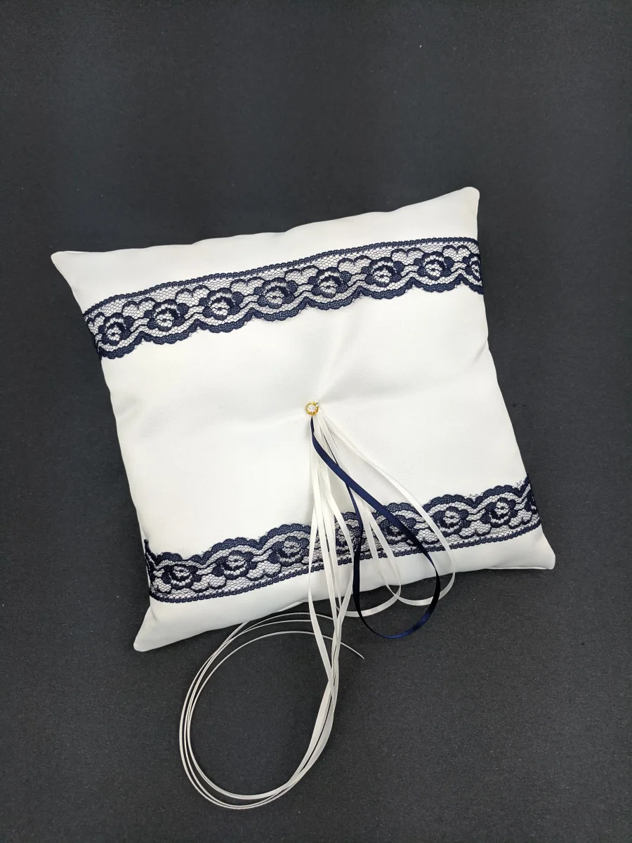 Coussin d’alliances en peau de soie blanc, avec dentelle marine et petit ruban assorti pour y attacher les alliances.