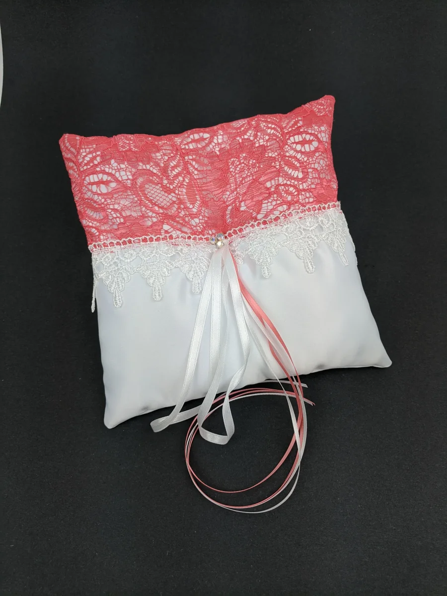 045A Coussin d’alliances blanc avec dentelle corail