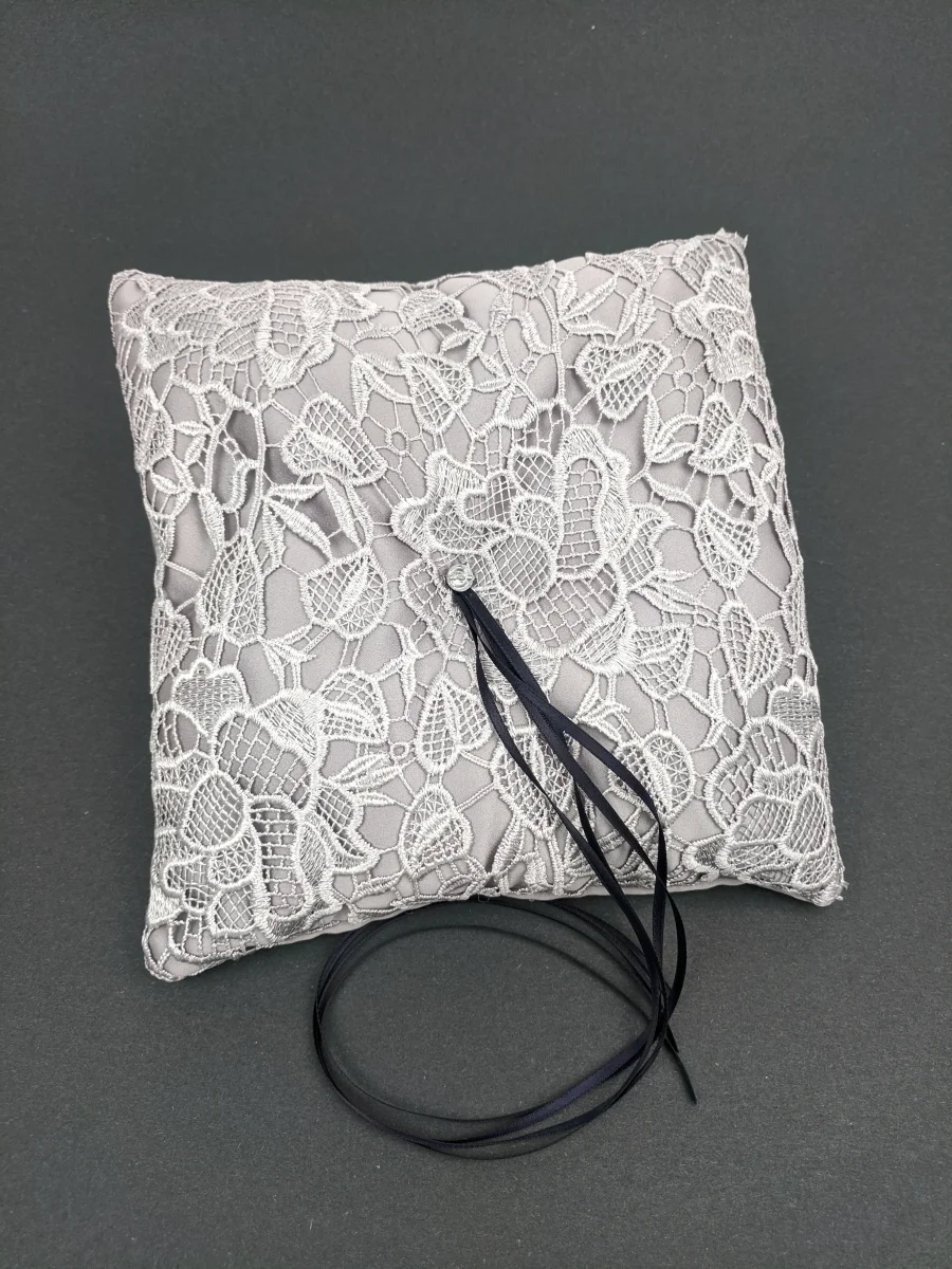 Coussin d’alliances en dentelle grise, avec ruban noir pour y attacher les alliances.