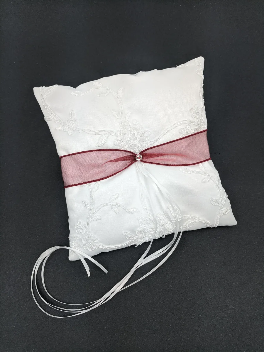 Coussin d’alliances en peau de soie blanc, avec ruban bourgogne et petit ruban assorti pour y attacher les alliances.
