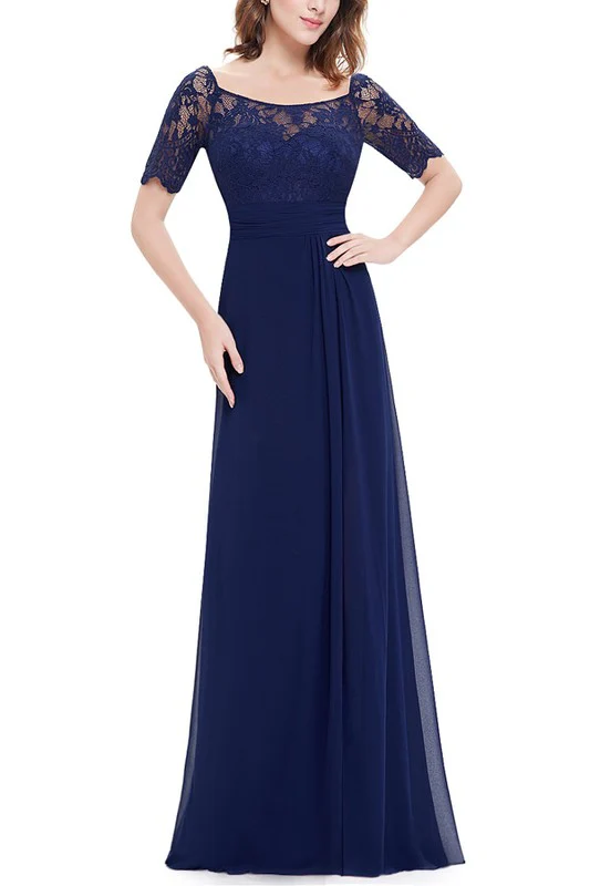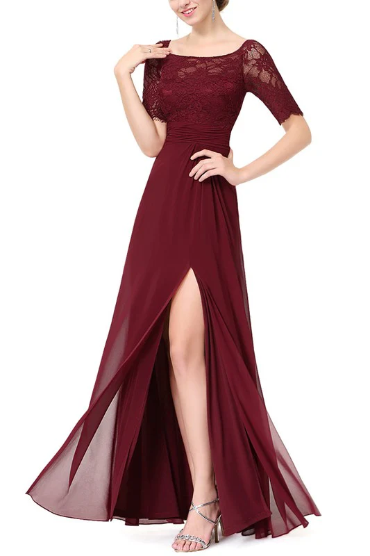 Robe de mère de mariés avec bustier en dentelle et manche 3/4, jupe en chiffon avec fente Robe style ligne en A