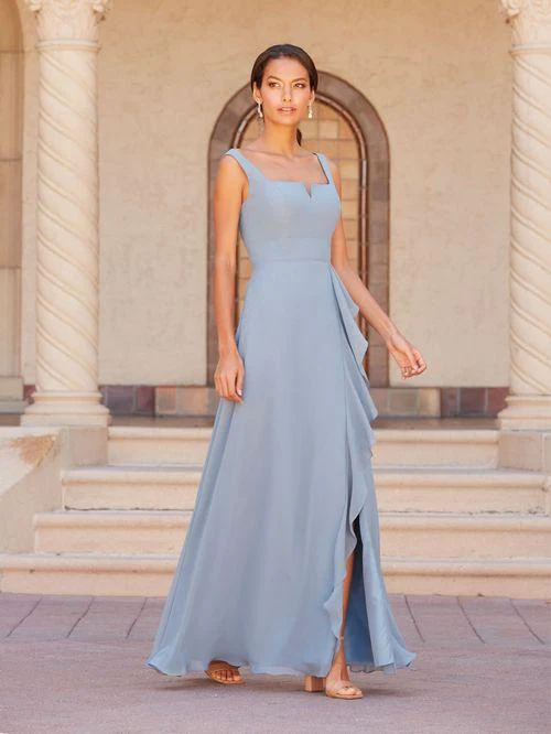 Show off your glamour side wearing this notched square neckline gown with wide straps. The ruffled front leading to an open slit and flowing A-line skirt will have you dancing the night away.