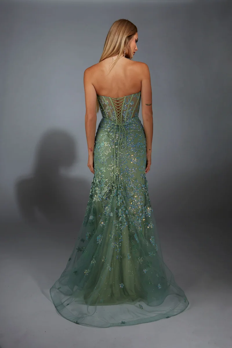 Cette robe ajustée brillante présente un décolleté en coeur sans bretelles. Le corsage transparent avec des détails de fleurs met en valeur votre silhouette, tandis que la fente sur le devant ajoute une touche de mouvement.