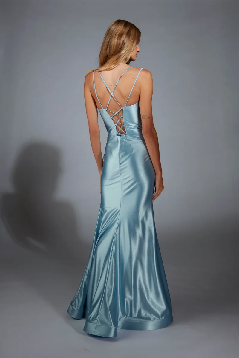 Robe en satin simple et élégante. Corsage et petites bretelles délicates qui s’accompagne d’un dos à lacets.