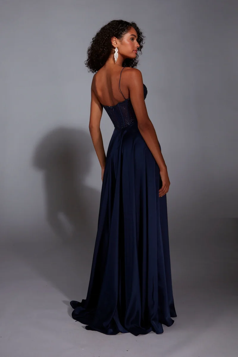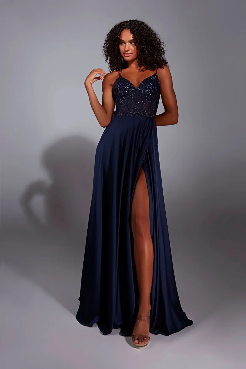 Corset brillant en V avec bretelles et jupe satiné avec une fente.