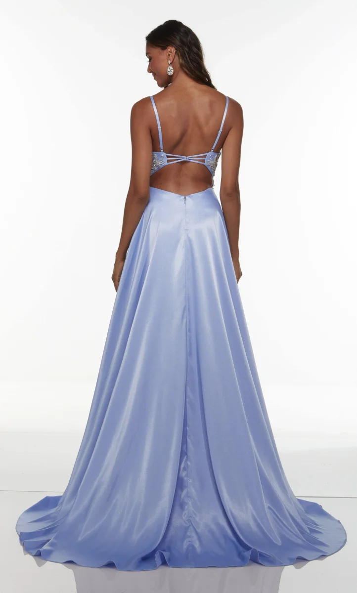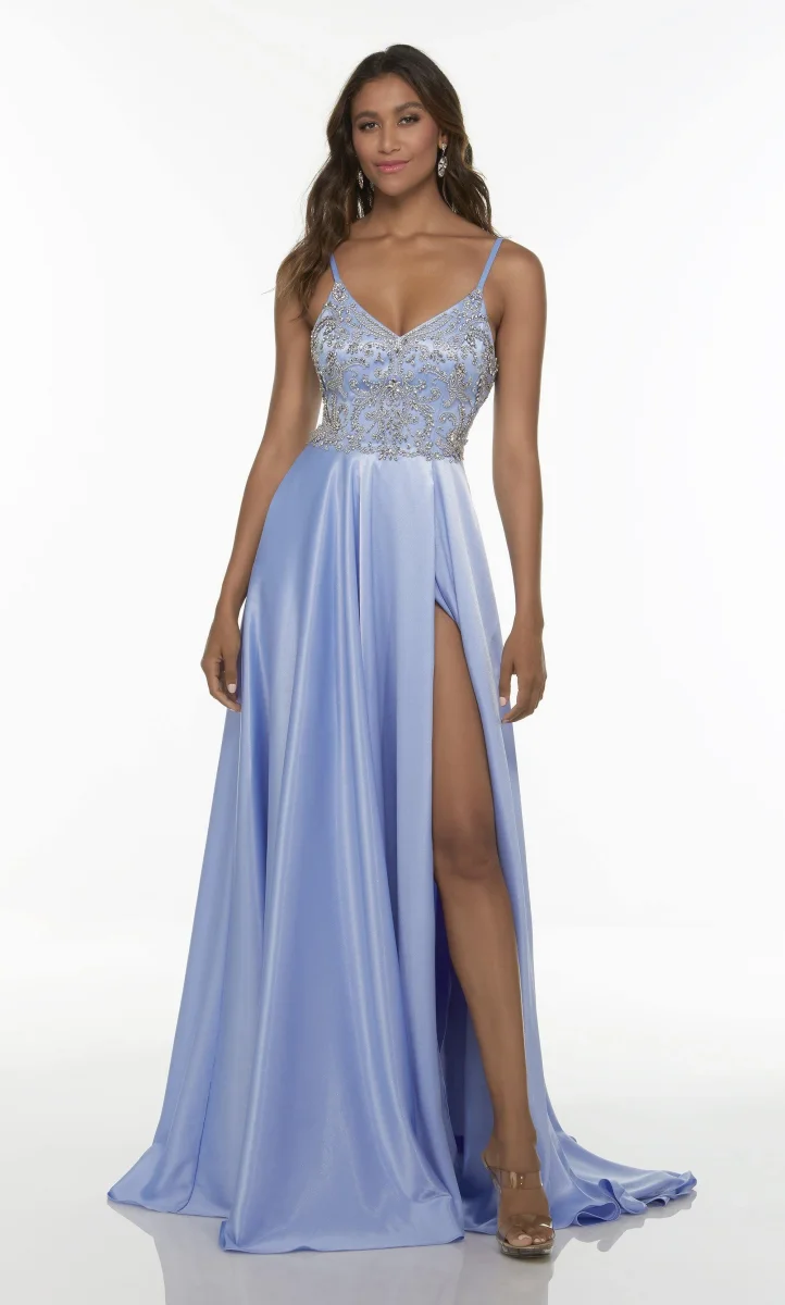 Joli robe longue, jupe en satin avec un haut orné de brillant. Dos ouvert et fente haute. Bretelles ajustables et belle traine.