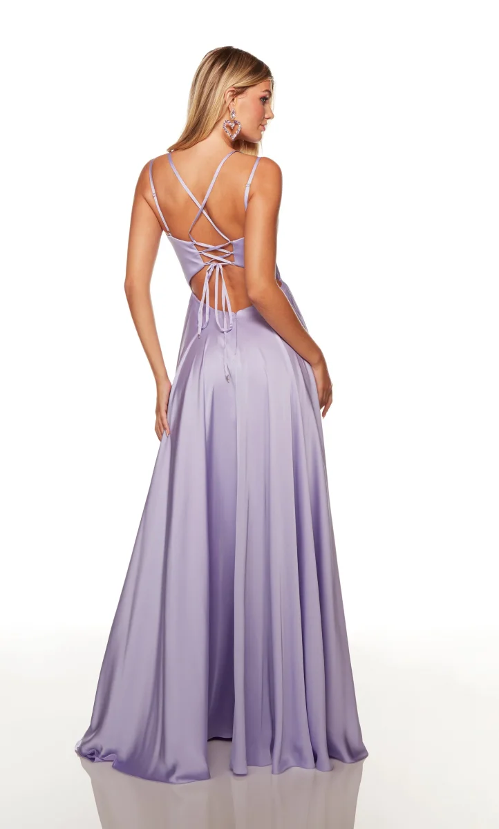 Confectionnée en mousseline de soie satinée, avec un décolleté tombant et des bretelles doubles spaghetti qui forment le dos lacé à bretelles. Cette robe de bal trapèze est complétée par une fente très haute et une belle traîne.