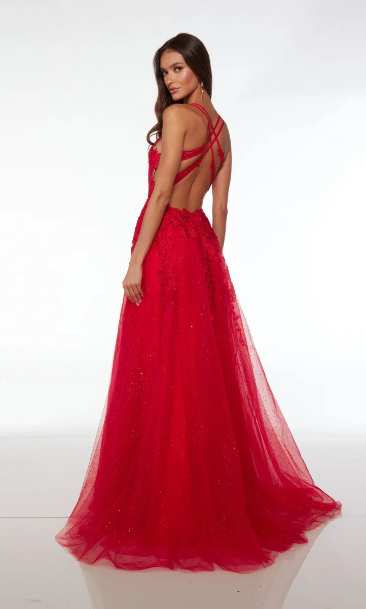Les doubles bretelles ajoutent une touche unique, tandis que le design sans manches le maintient contemporain. La robe présente des détails qui créent un effet enchanteur, et la fente haute ajoute une touche dramatique. Avec un dos croisé et une traîne balayante, cette robe offre à la fois style et élégance.