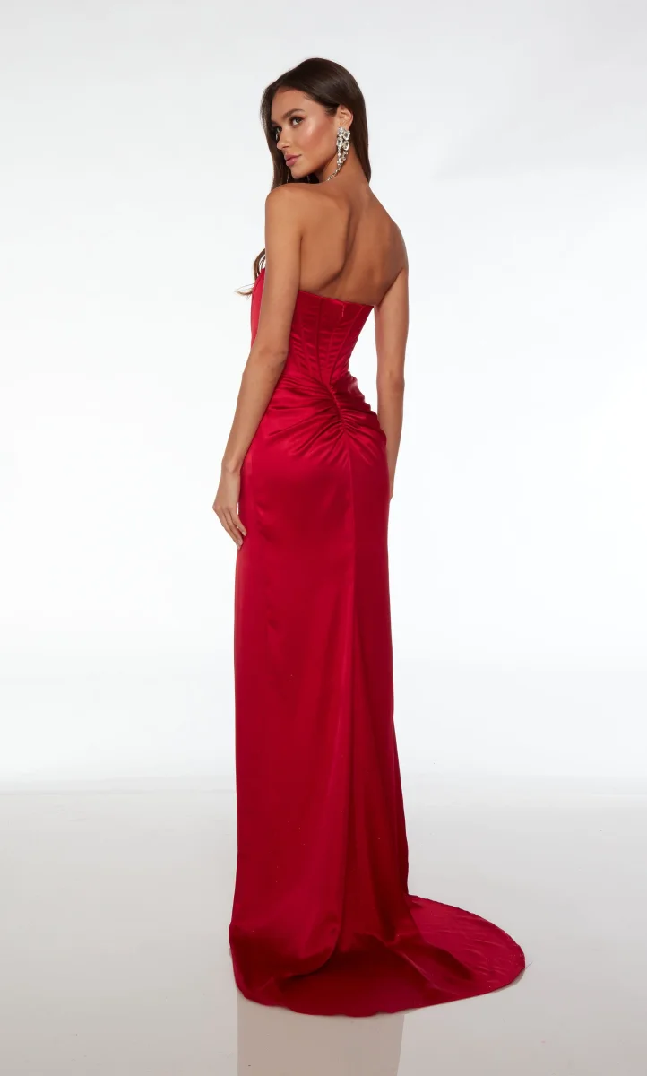 L’encolure droite sans bretelles encadre magnifiquement vos épaules. Le corsage crée une silhouette flatteuse et près du corps, tandis que les détails au corset ajoutent une touche de texture. Une fente haute audacieuse sur le devant de la robe et le dos ouvert avec la fermeture éclair complètent le look.
