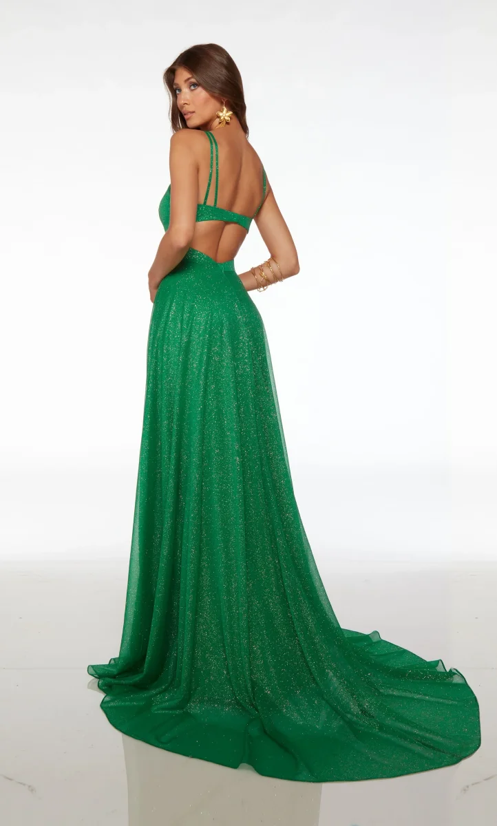 Confectionnée en tulle pailleté exquis, cette robe scintille à chaque mouvement que vous faites. Les doubles bretelles spaghetti offrent un look chic et de maintien, tandis que le décolleté en V ajoute une touche délicate. La fente haute et le dos ouvert ajoute une touche moderne à la silhouette classique, et la fermeture éclair dissimulée au dos assure un ajustement sûr.