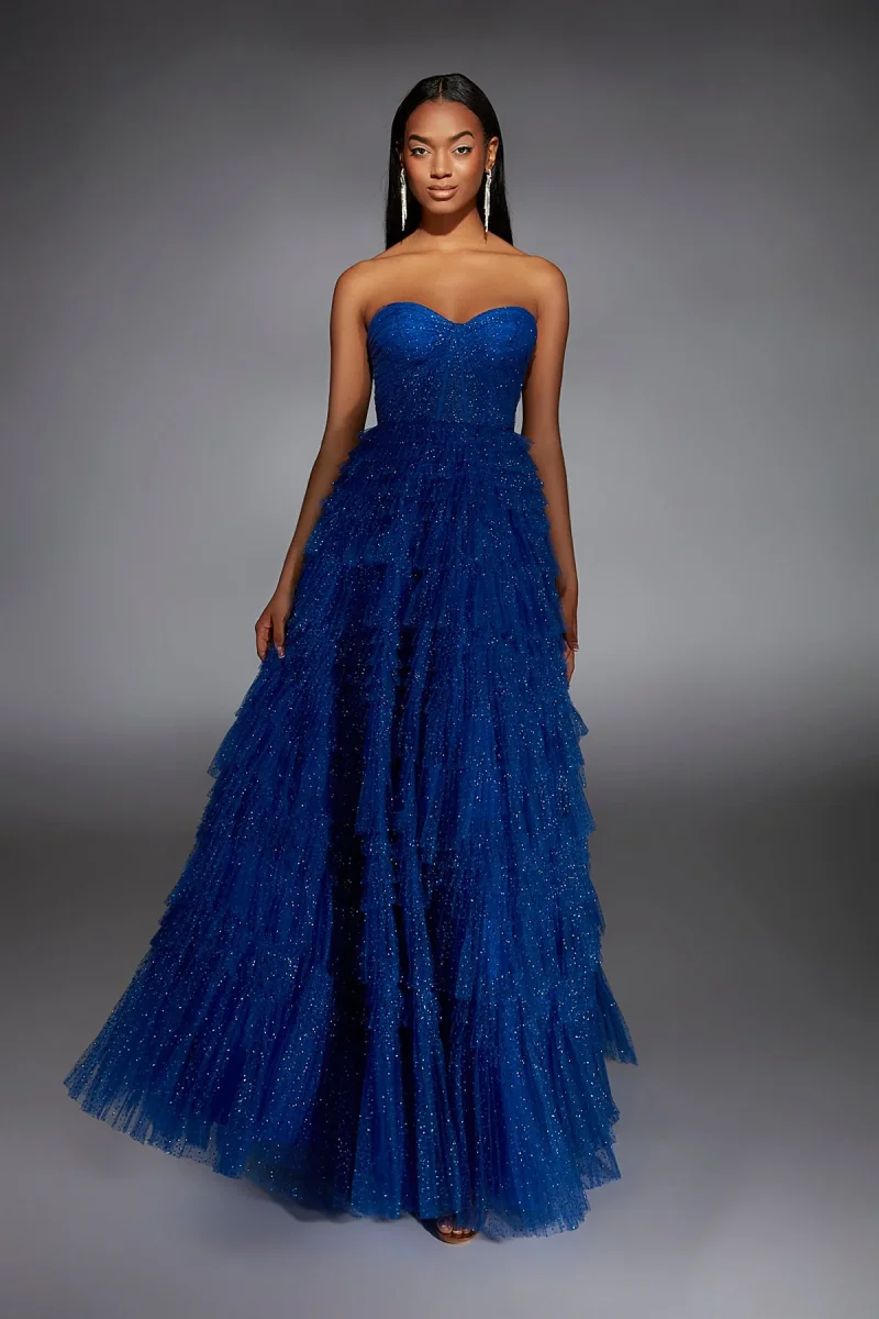 Éblouissante et raffinée, cette robe de bal Alyce Paris en tulle pailleté séduit avec son corset structuré et son encolure cœur sans bretelles. Sa jupe A-line à volants et son dos ouvert en font un choix chic et glamour pour un bal ou toute occasion spéciale.