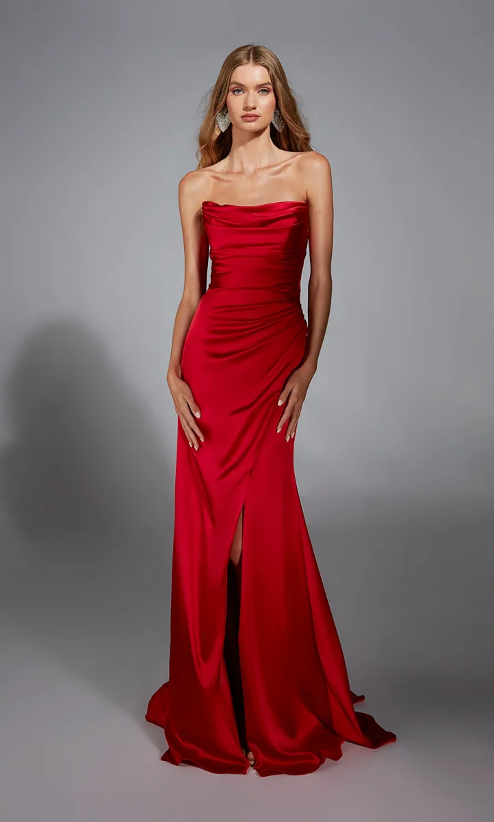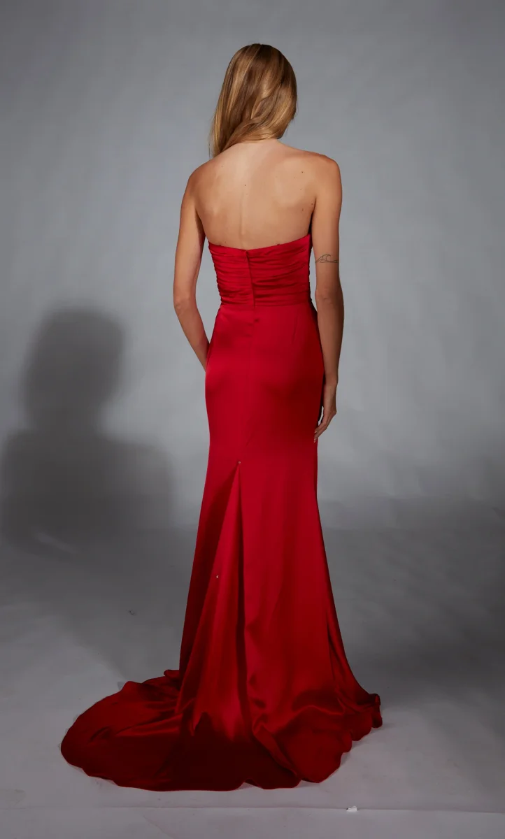Confectionnée en satin élégante, cette robe ajustée présente un décolleté droit sans bretelles avec possibilité de manches. Le corsage froncé met en valeur votre silhouette, tandis que la fente sur le devant ajoute une touche de mouvement. Que vous assistiez à un bal de fin d’année ou à un autre événement spécial, ce modèle saura impressionner.