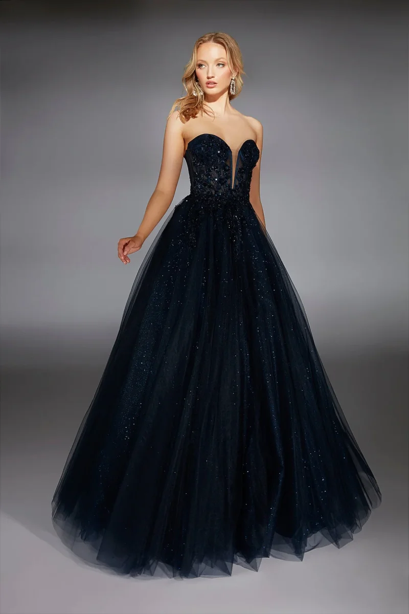 Sublime et raffinée, cette robe de bal signée Alyce Paris séduit par son corsage illusion à baleines apparentes, sublimé de dentelle appliquée et de perles scintillantes. Son décolleté en V profond met en valeur la silhouette avec élégance, tandis que la coupe princesse offre un volume majestueux et une allure de conte de fées. Sans bretelles, cette création allie modernité et romantisme pour un look inoubliable.