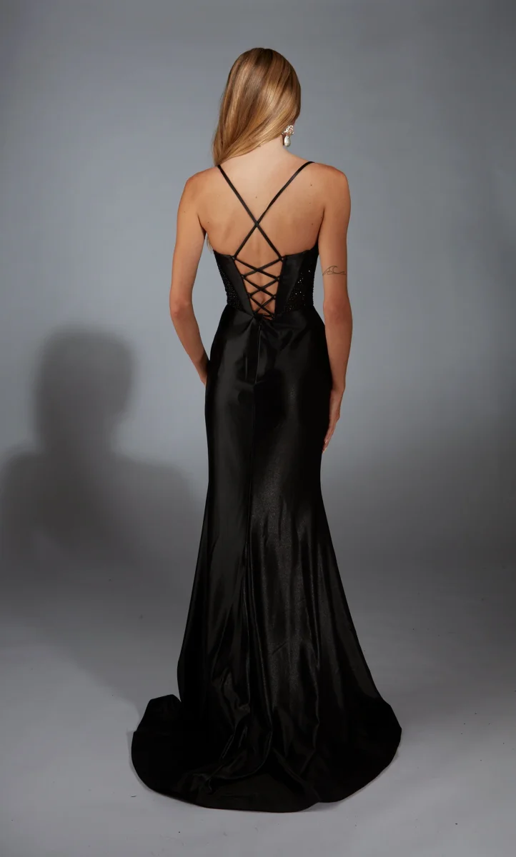 Cette robe exquise présente un corsage captivant avec un décolleté. Confectionnée à partir de luxueux satin extensible métallisé, la robe épouse vos courbes tout en offrant confort et style. La fente audacieuse jusqu’à la cuisse, ajoutant une touche dramatique et permettant un mouvement gracieux. Parfaite pour un bal de fin d’année ou tout événement formel, cette robe vous assure de briller de mille feux et de faire tourner les têtes.