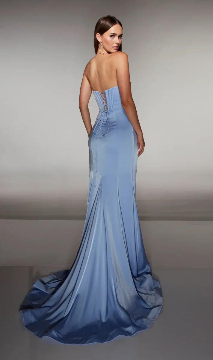 Séduisante et sophistiquée, cette robe de soirée en satin bleu ciel incarne l’élégance moderne. Son bustier structuré, rehaussé de délicates incrustations scintillantes, sublime le décolleté tout en apportant une touche glamour. La taille est finement drapée pour créer une silhouette élancée et flatteuse.La fente haute dévoile la jambe avec subtilité et ajoute un effet spectaculaire à chacun de vos pas, tandis que la traîne fluide offre un mouvement majestueux.