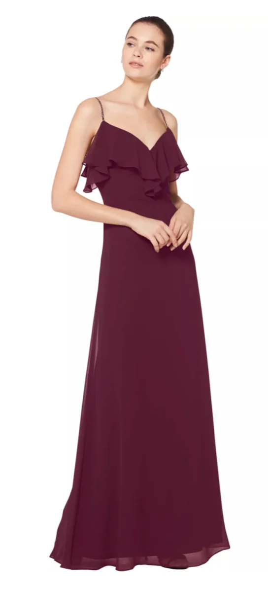 Chiffon V-neck gown with beaded spaghetti straps. Ruffle trim accents the bodice with a wide U back.
