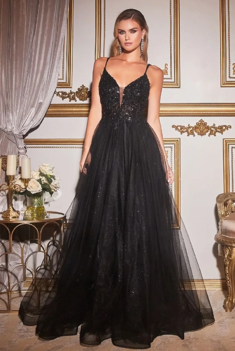 Une de nos favorites; cette robe trapèze est superposée de plusieurs épaisseurs de tulles luxueux et scintillants. Elle est également ornée d’appliqués de dentelle pailletée. Le corsage en dentelle illusion a un décolleté profond et de fines bretelles doubles pour un détail ouvert dans le dos.