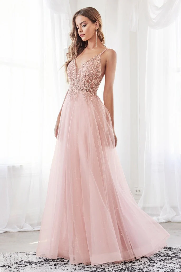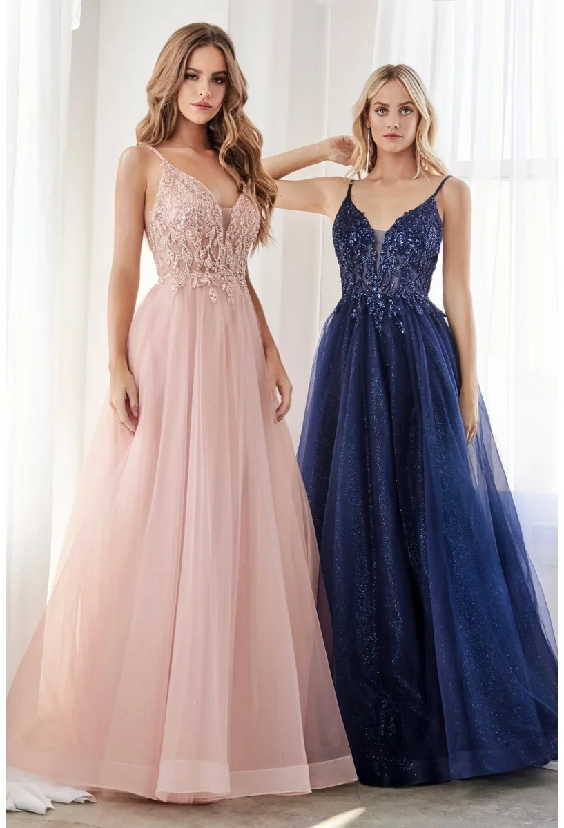 Une de nos favorites; cette robe trapèze est superposée de plusieurs épaisseurs de tulles luxueux et scintillants. Elle est également ornée d’appliqués de dentelle pailletée. Le corsage en dentelle illusion a un décolleté profond et de fines bretelles doubles pour un détail ouvert dans le dos.