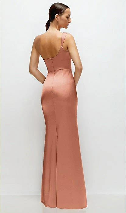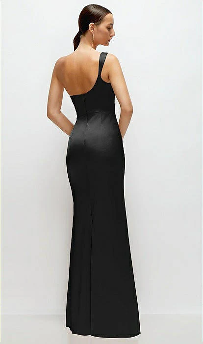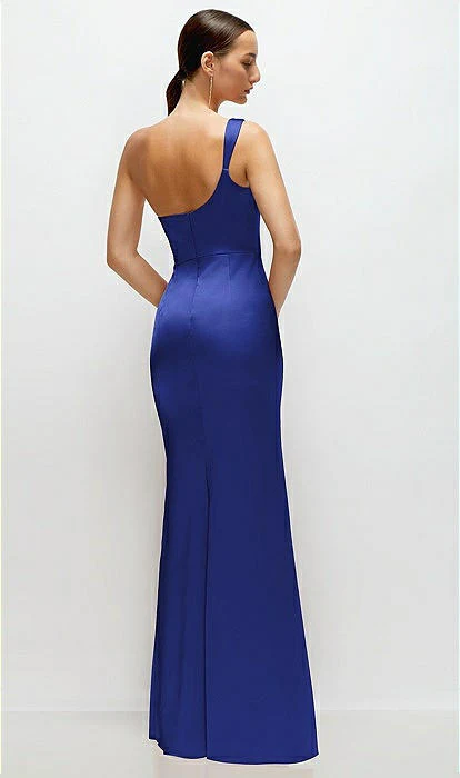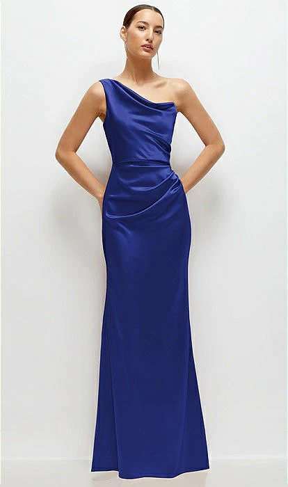 This stunning satin maxi dress channels some serious goddess energy with its effortlessly chic one-shoulder neckline that’s all about those soft, sculpted lines. The asymmetrical pleated cat-eye cowl detail adds a pop of drama, draping perfectly for that laid-back elegance. Crafted in smooth, neu stretch charmeuse, the dress hugs your curves with a fit-and-flare silhouette while gentle drapes gather at the side, giving it a captivating, fluid movement. It’s the kind of dress that feels both classic and fresh, ready to turn every step into a moment.