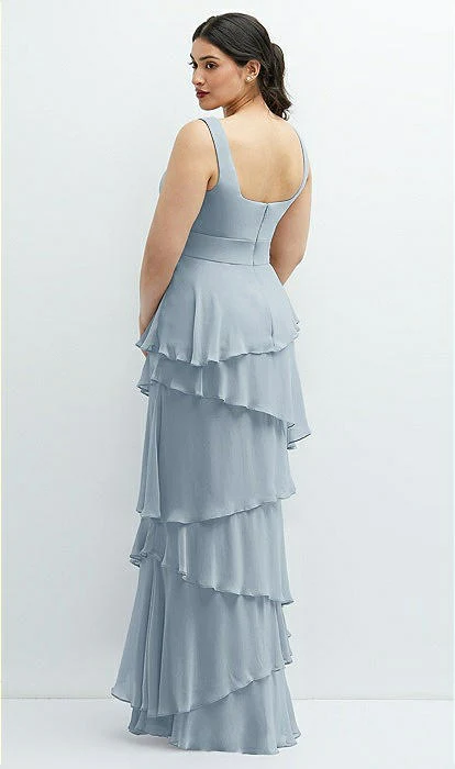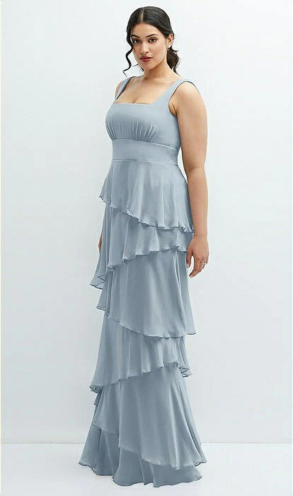 Cette robe longue romantique est entièrement composée de magnifiques couches en cascade de mousseline luxueuse, savamment inclinées pour créer un équilibre parfait entre asymétrie et symétrie. Son encolure carrée et son ventre galbé ajoutent une touche intemporelle à l’ambiance romantique. Le tissu en mousseline de soie aérée coule magnifiquement jusqu’au sol, vous donnant un look élégant sans effort.