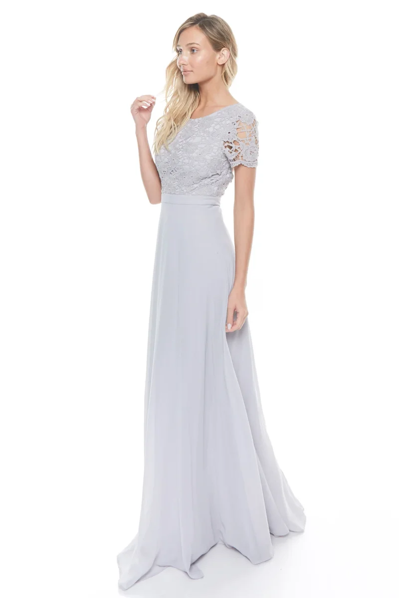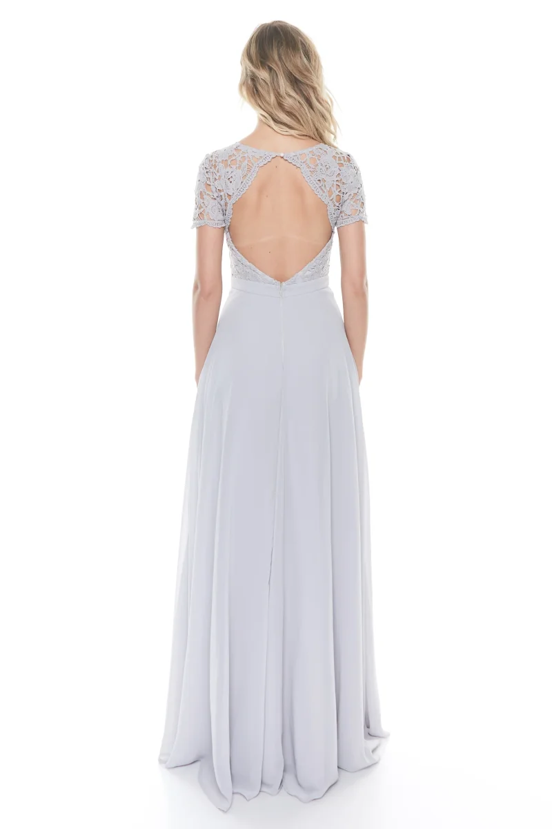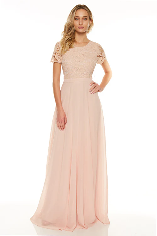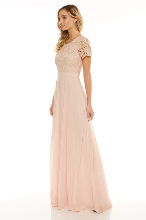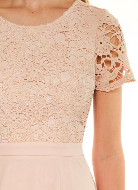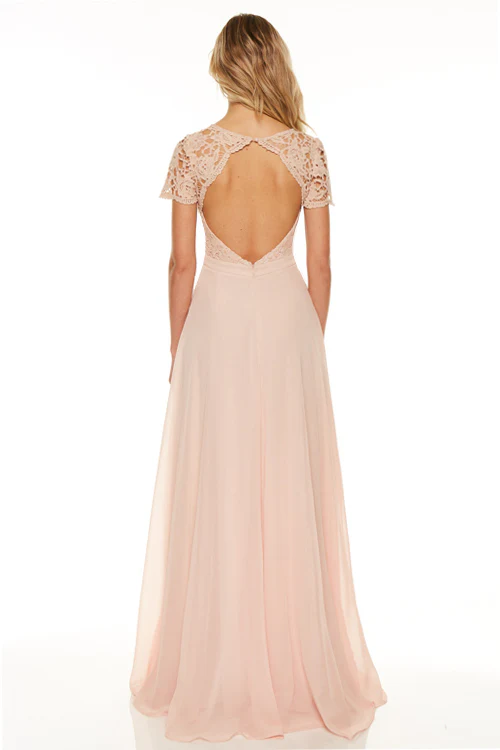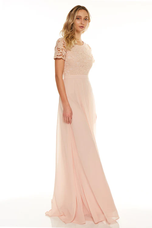Une robe fabriquée de dentelle à petites manches courtes. Sa ligne « A » et ses fronces au ventre avantage la silhouette. Elle offre un dos ouvert pour une touche originale.