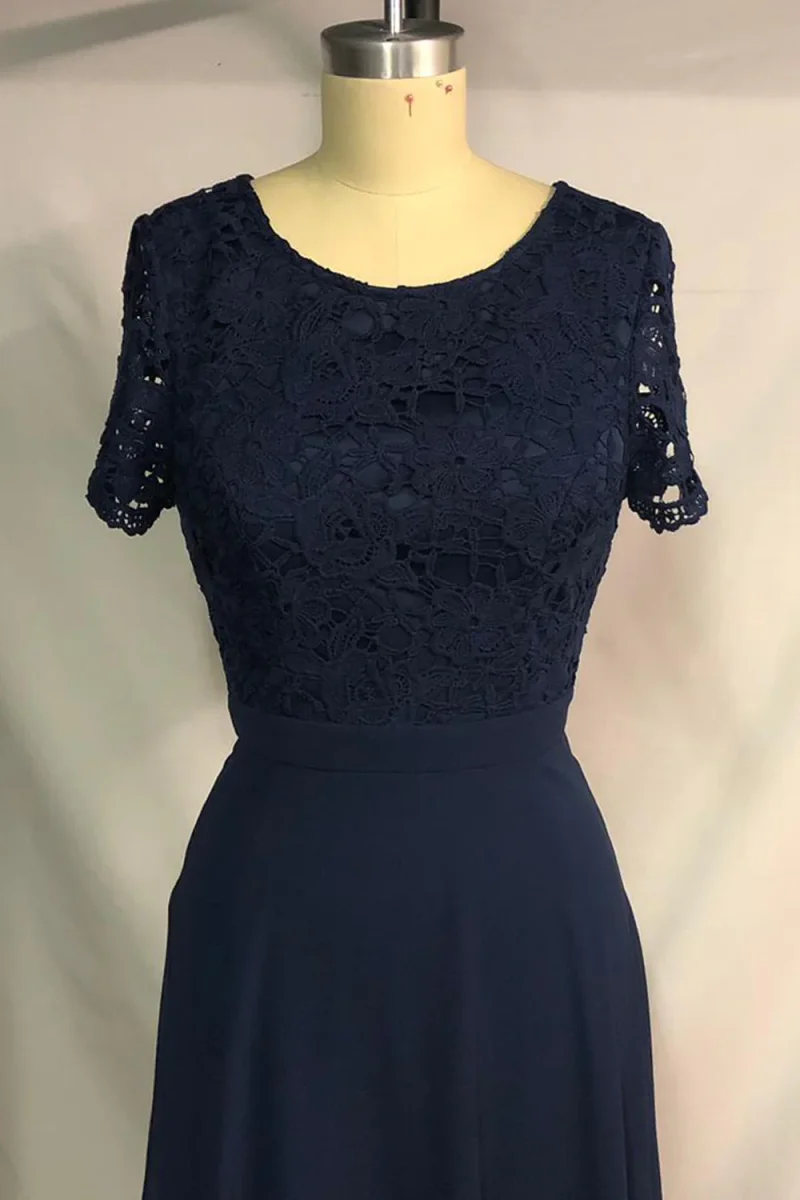 A lace dress with short sleeves. His « A » line and his belly hems benefit the silhouette. It offers an open back for an original touch.