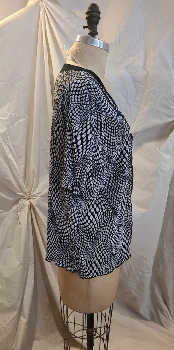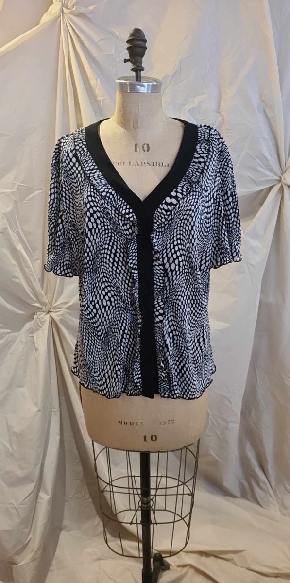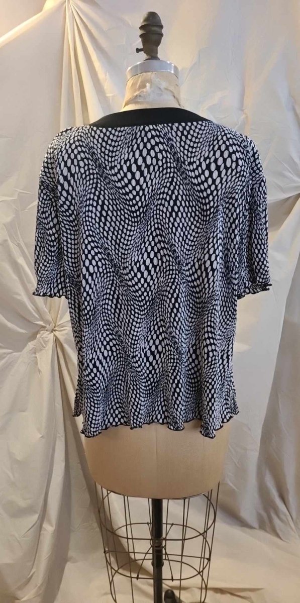 De la marque MODES CRYSTAL, vintage. Encolure en V avec lisière ondulé au col et le long de la boutonnières. Tissu froissé effet accordéon, à pois blancs sur fond noir. Élastique aux manches. Gr. 20 (Fit XXL) Épaules 19 po poitrine 51 po Manche 9 po Longueur. 25,5 po 100 % polyester Fait au Canada