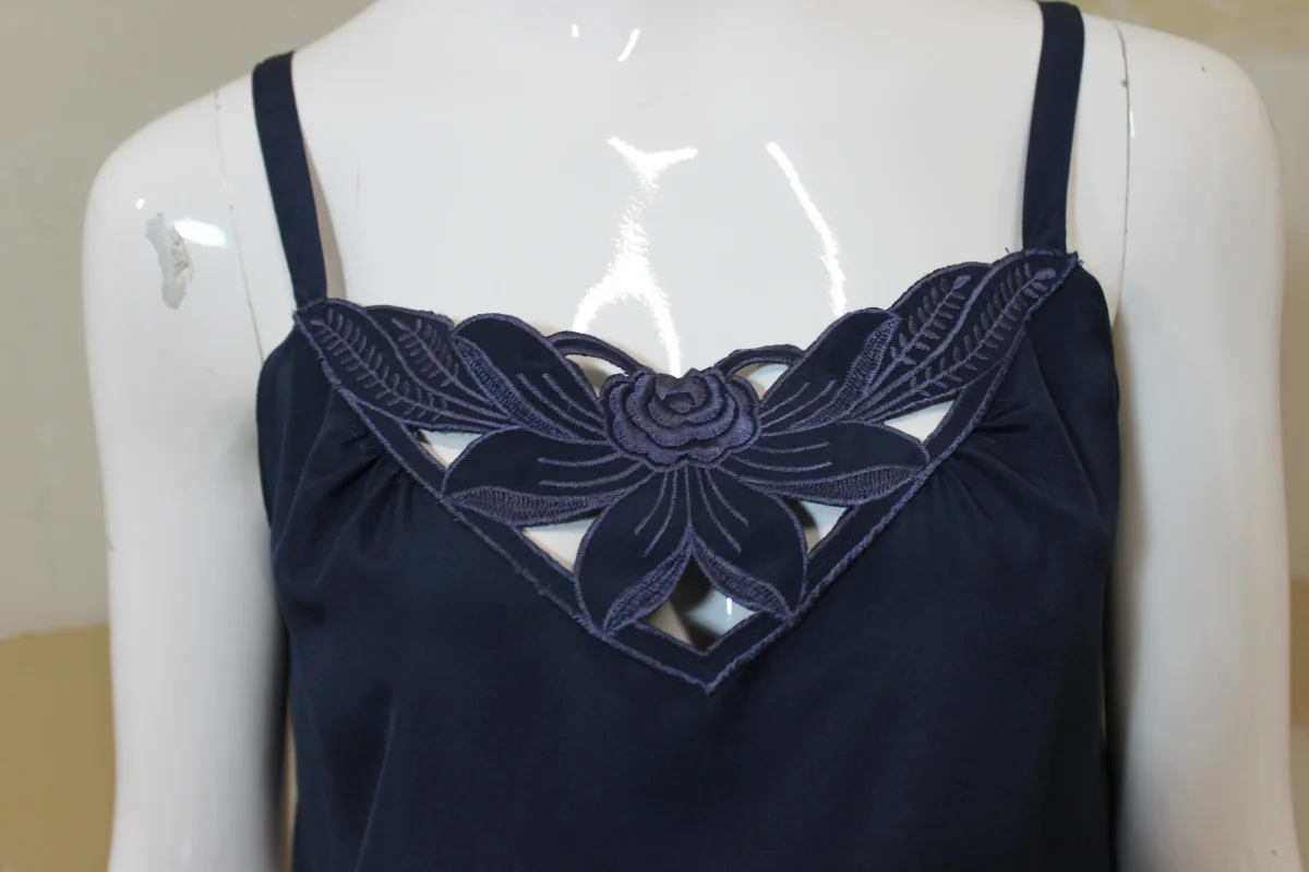 Camisole déshabillée en satin marine, vintage. Encolure carrée avec empiècement fleur brodée ajourée. Bretelles fine.