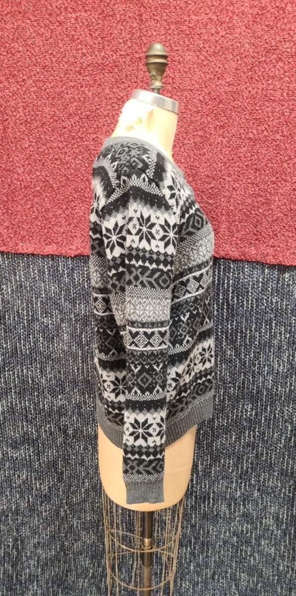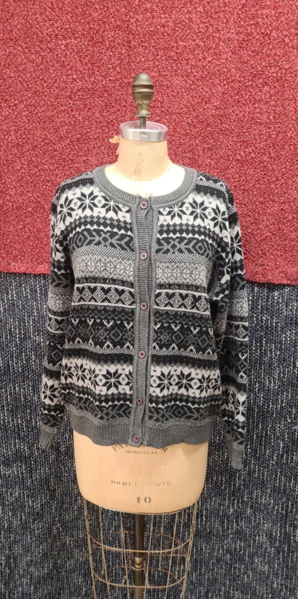 Cardigan à motifs hivernaux gris et noir. De la marque ANALU MALHARIA, vintage. Boutonné au devant. Encolure ronde. Fit L (Femme) Épaules 17 po Poitrine 26 po Manche 24 po Longueur 25 po N’a pas d’étiquette / probablement acrylique État vintage 9/10
