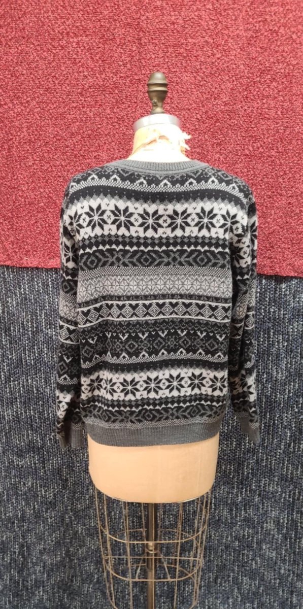 Cardigan à motifs hivernaux gris et noir. De la marque ANALU MALHARIA, vintage. Boutonné au devant. Encolure ronde.