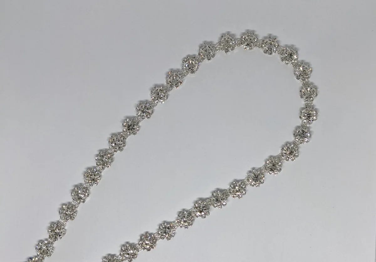 • Measure of the belt: Length: 46 cm (rhinestones only without ribbon) – Width: 1 cm widest pattern
