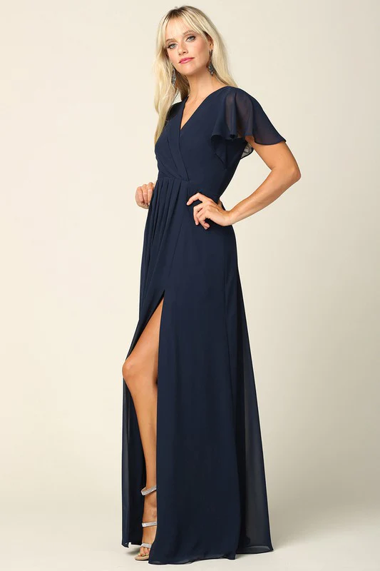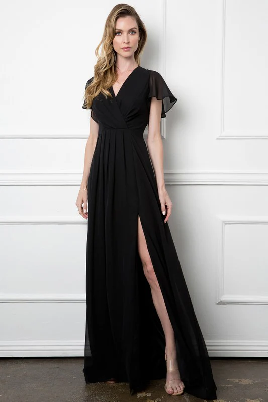 Cette robe est magnifique avec tous ses détails : une robe légère à manche courte à volant, le col en « V », la fente à sa jambe gauche et son dos couvrant. Un classique intemporel.