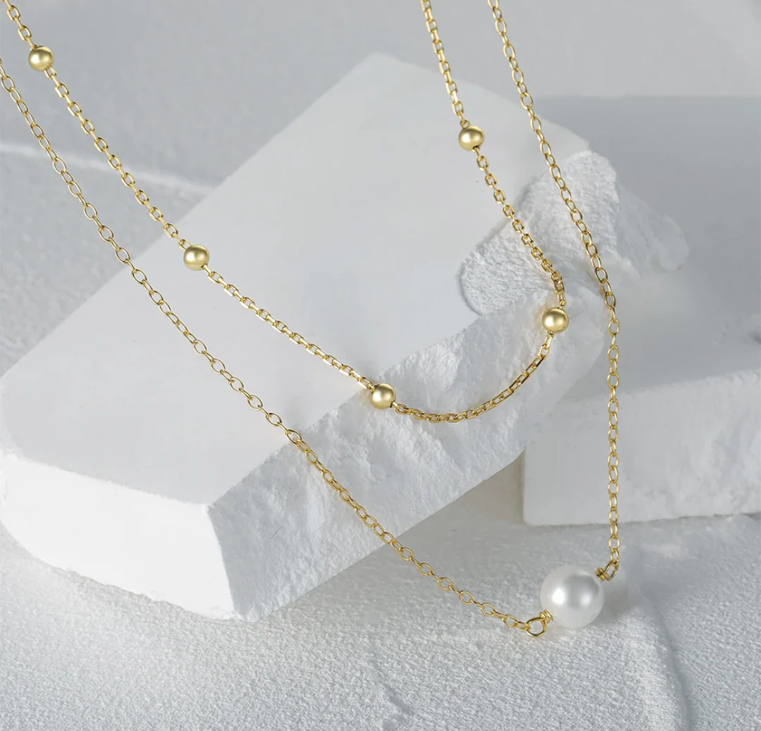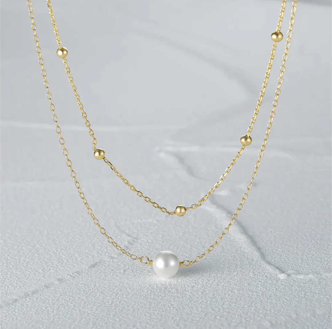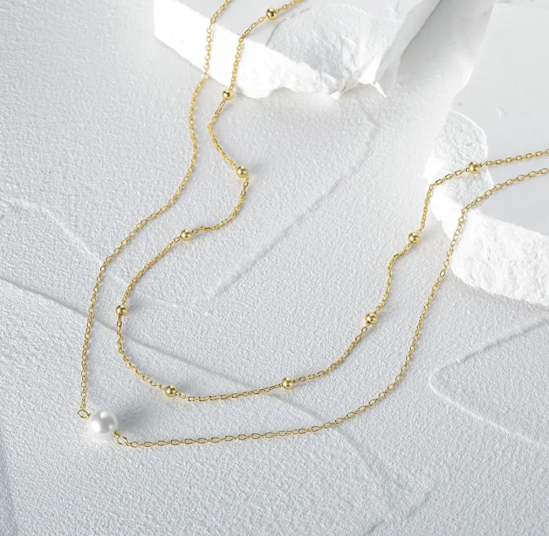 Delicate necklace with a double chain, one adorned with a pearl and the other with small gold-colored beads.