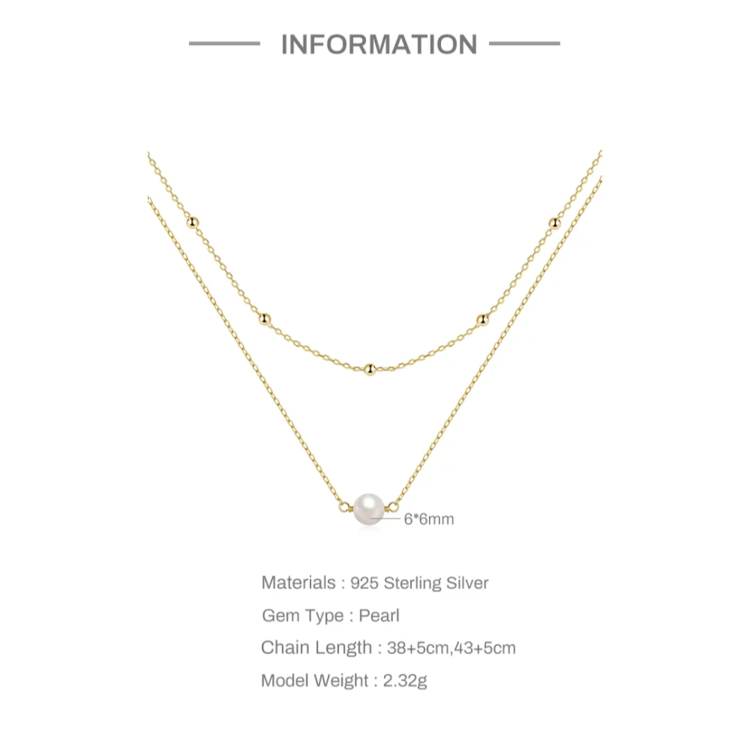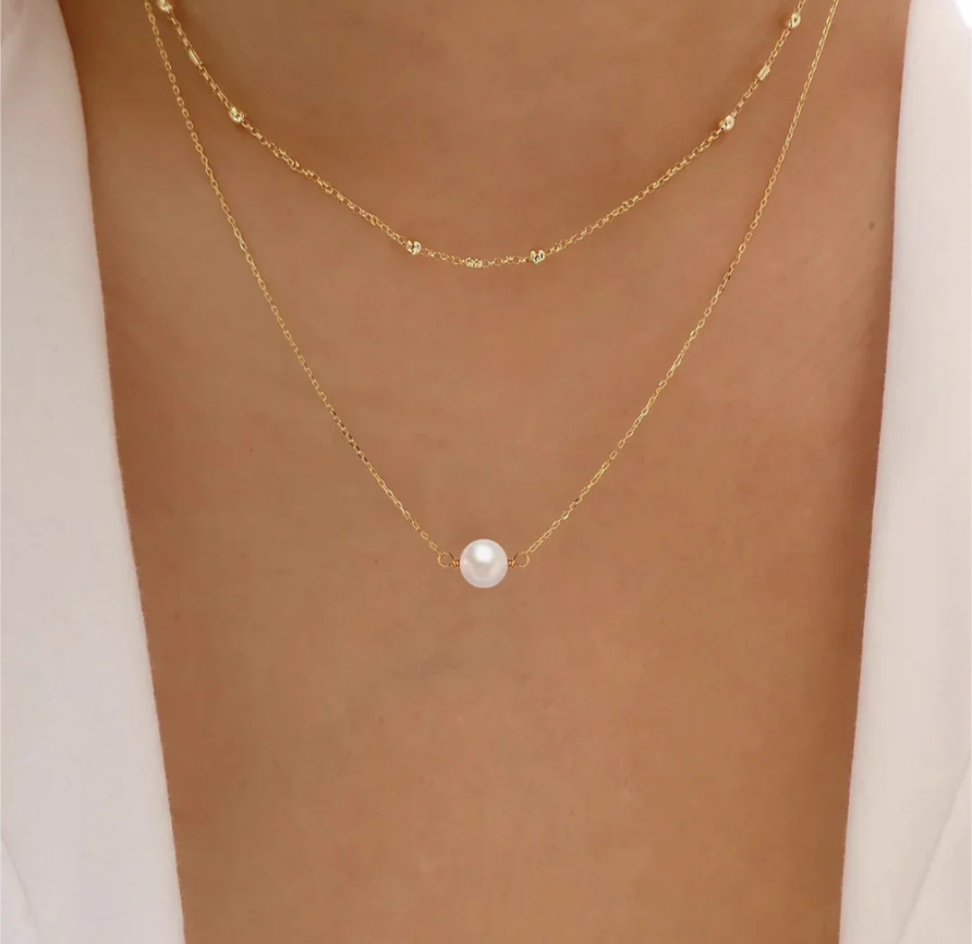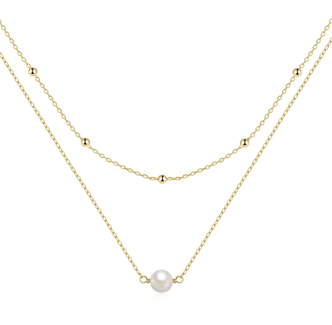 Delicate necklace with a double chain, one adorned with a pearl and the other with small gold-colored beads.
