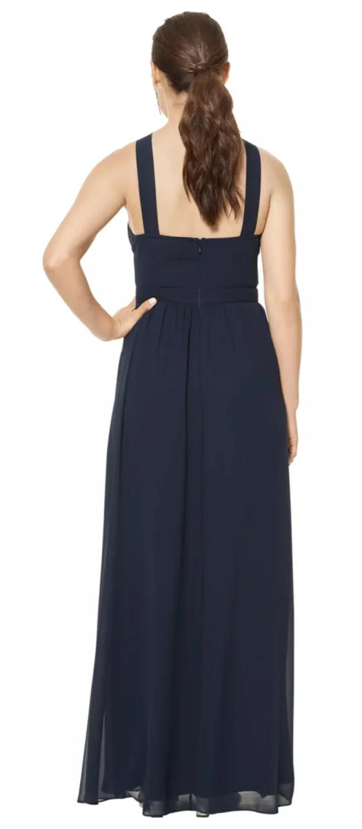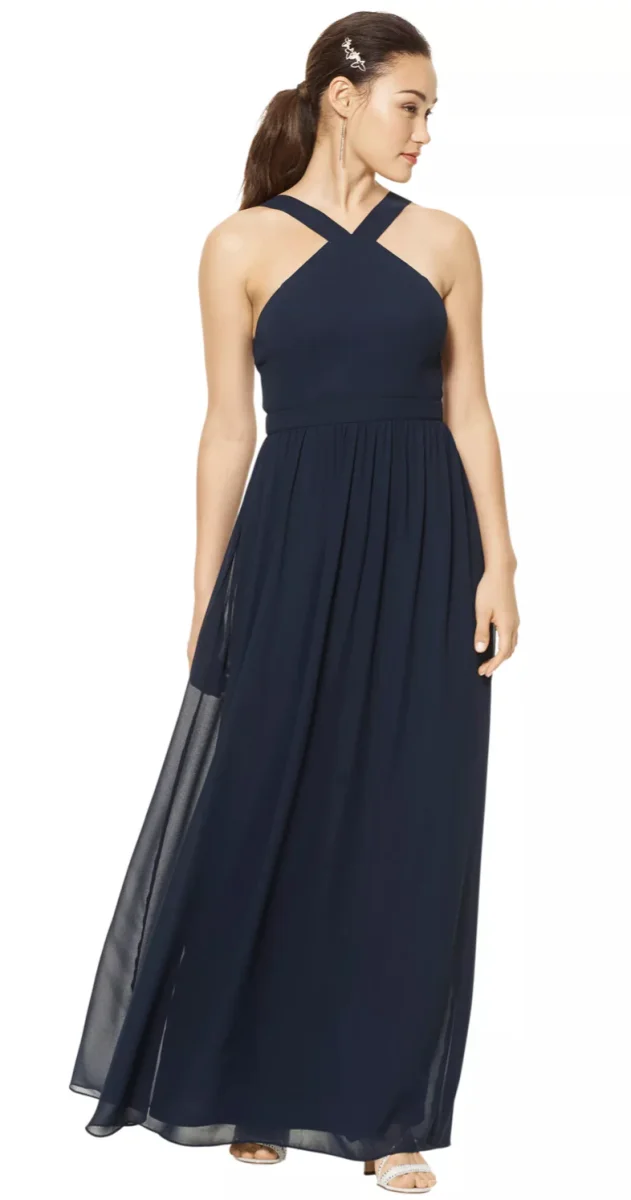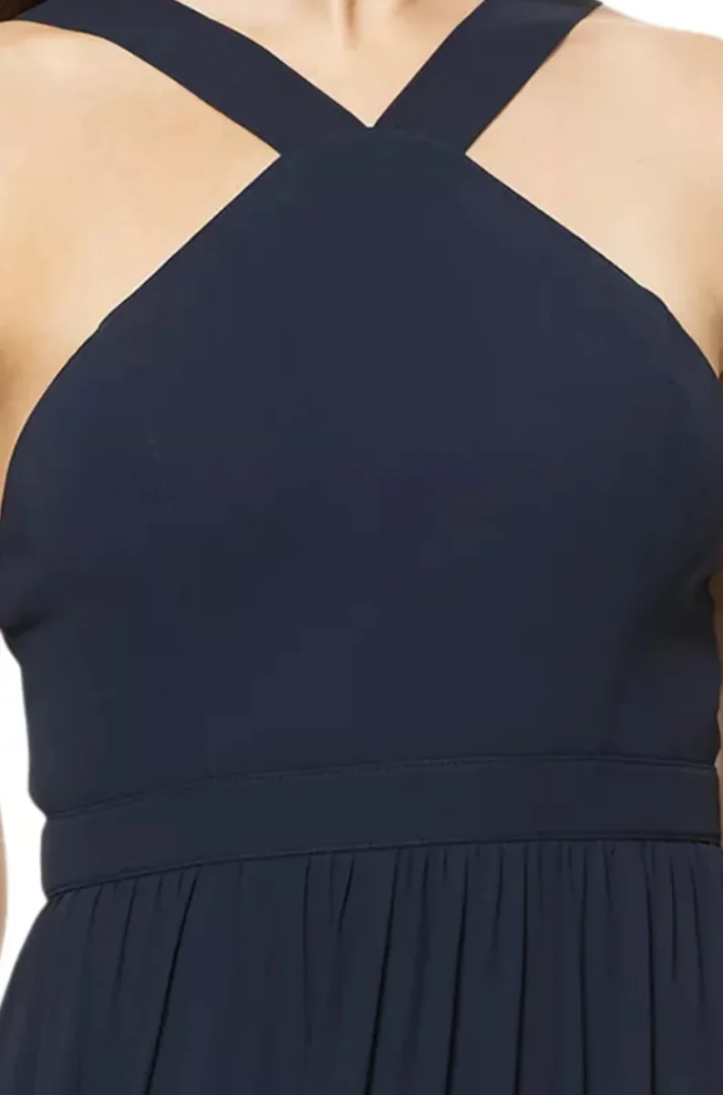 Chiffon halter gown with wide straps. Self-inset band at the waist. Soft gathers adorn the A-line skirt.