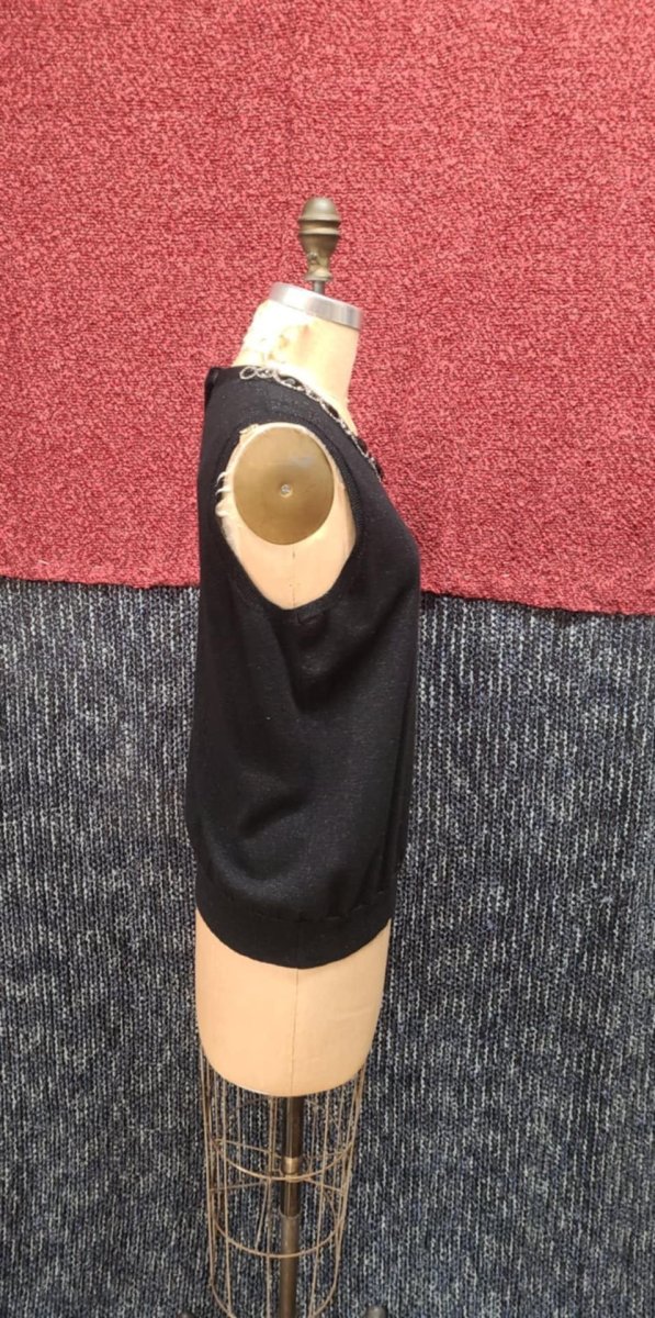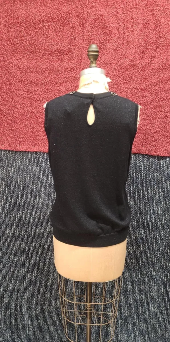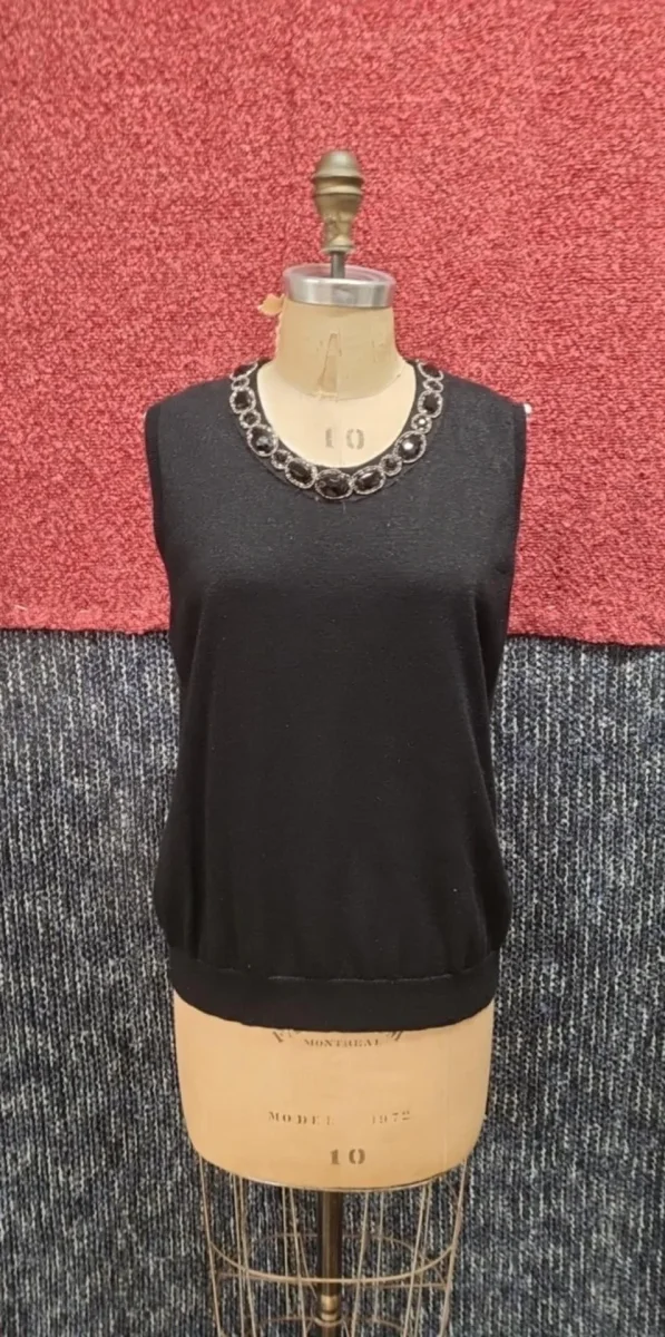 Débardeur noir scintillant de la marque JONES NEW YORK, COLLECTION. Encolure ronde ornée de pierres noires et argent. S’attache au dos avec un bouton au niveau de la nuque. En tricot légèrement extensible.