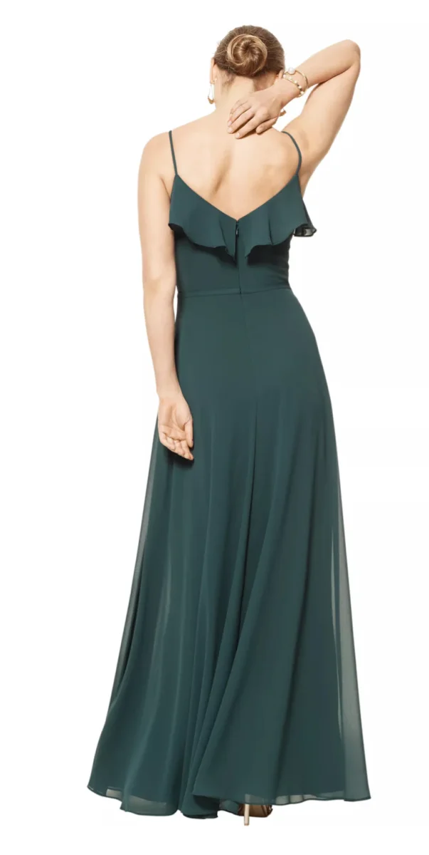 Chiffon spaghetti strap gown. V-front and back accented with ruffle trim. Mini-band accents the natural waist. A-line skirt.