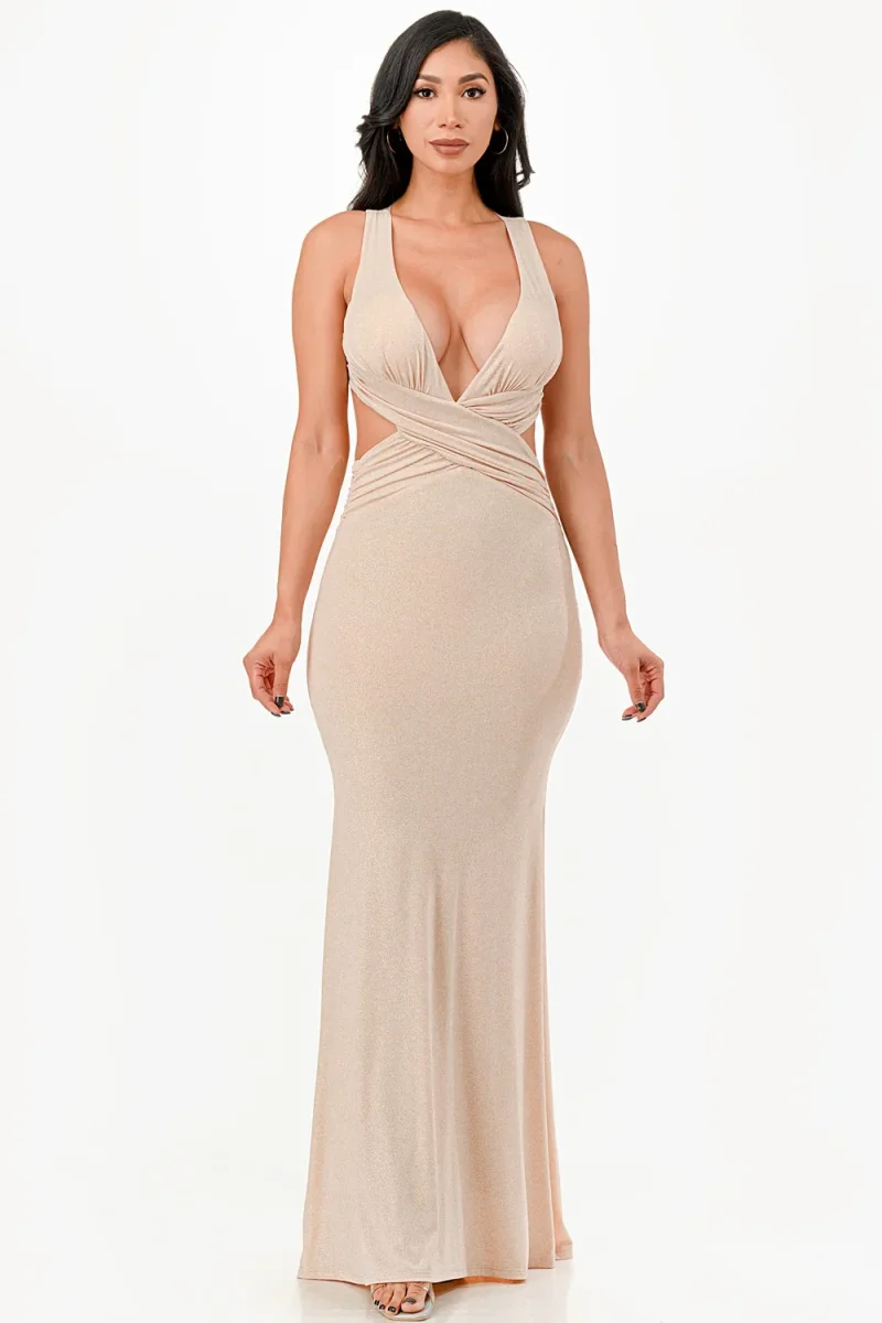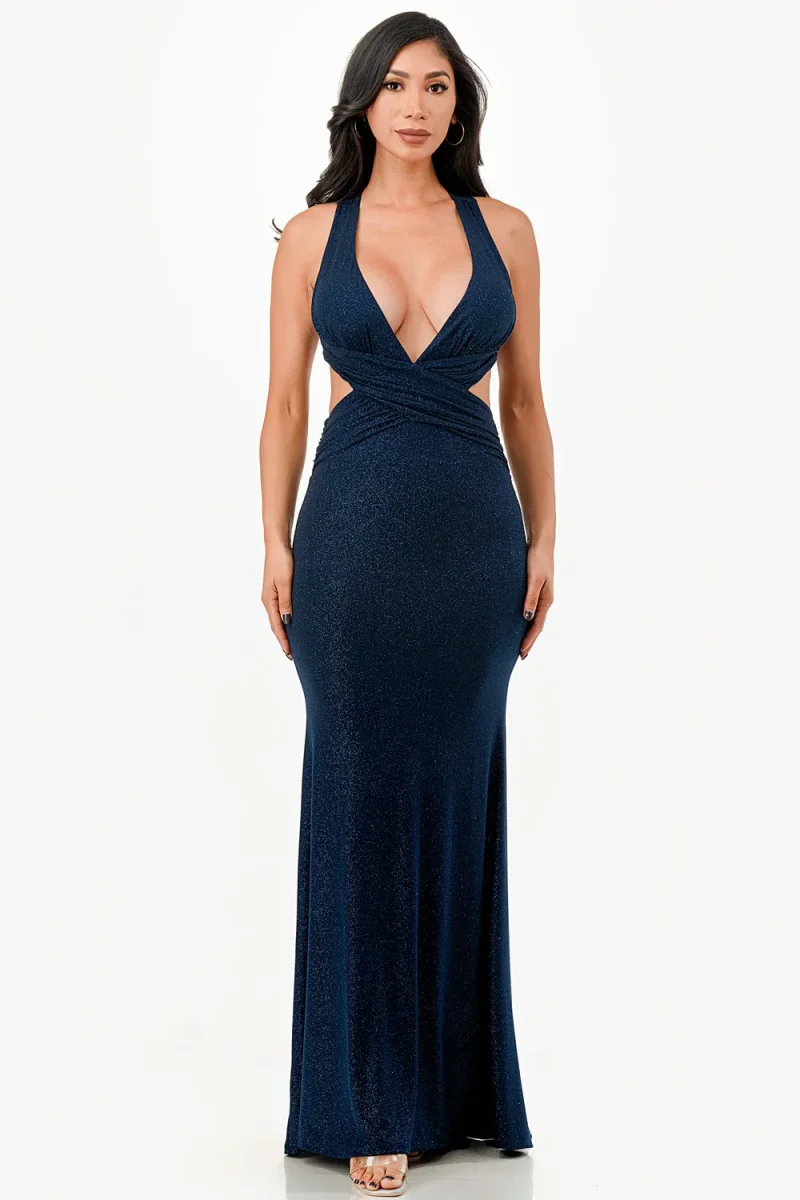 An elegant sheath dress featuring sparkling accents, a criss-cross back design, and gathered details for added texture. The halter neckline and V-shaped front create a bold, sensual vibe, complemented by side cutouts and an open back for an extra hint of charm. Crafted in the USA with 6% spandex, this dress is ideal for celebrations and special occasions.