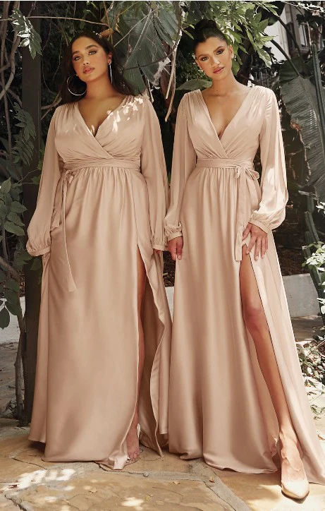 Long sleeve satin dress:this floor length gown features romantic split blouson sleeves, a pleated wrap-effect bodice and deep v-neckline.