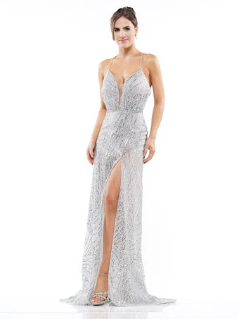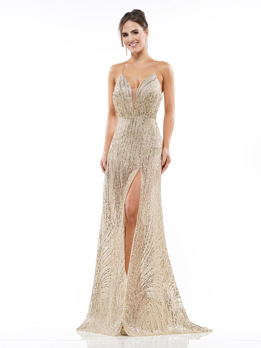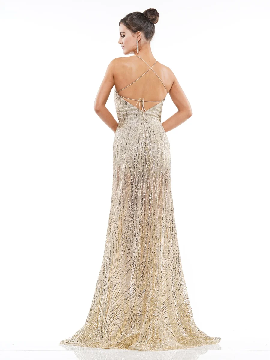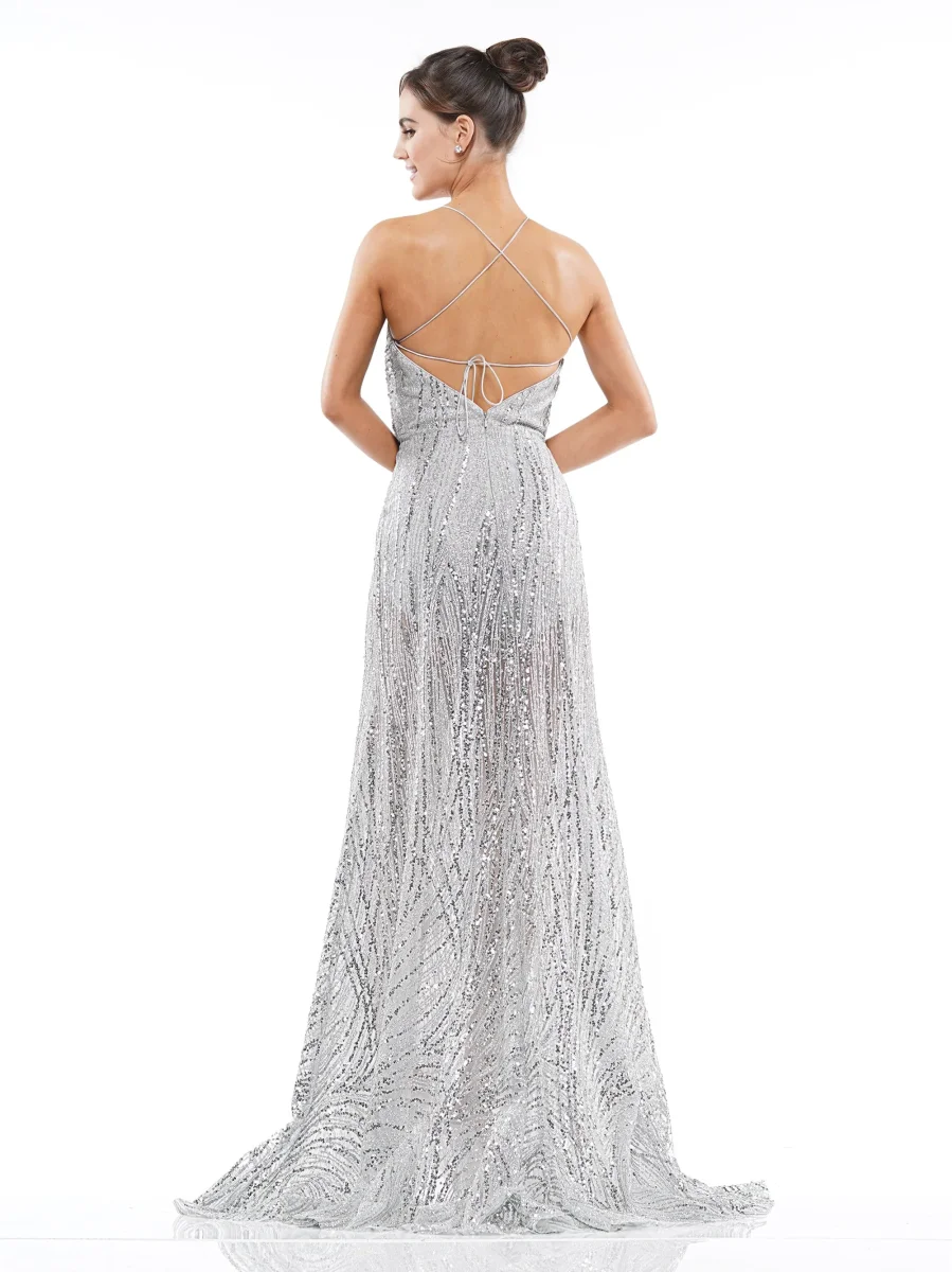 Sequin gown with gathered deep v neckline and strappy back.