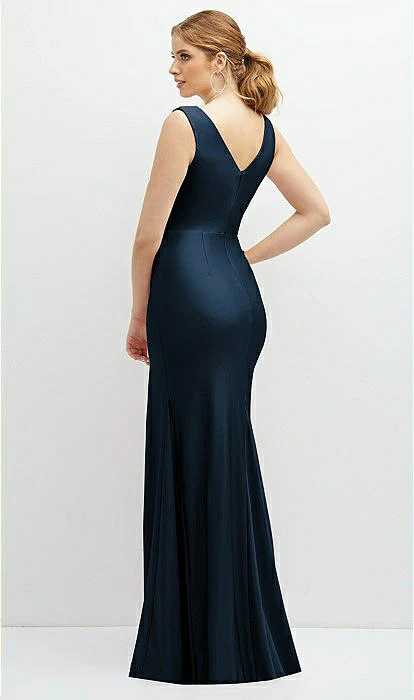 A sophisticated design calls attention to the flattering look of a Luxe stretch satin maxi dress that serves a bridal party with ultimate style. This form-fitting dress features a draped V-neckline with slight rouching, and a V-neck back flowing into a mermaid-inspired silhouette. A tempting side skirt slit and horsehair hem completes the decadent flavor of an exceptional dress.