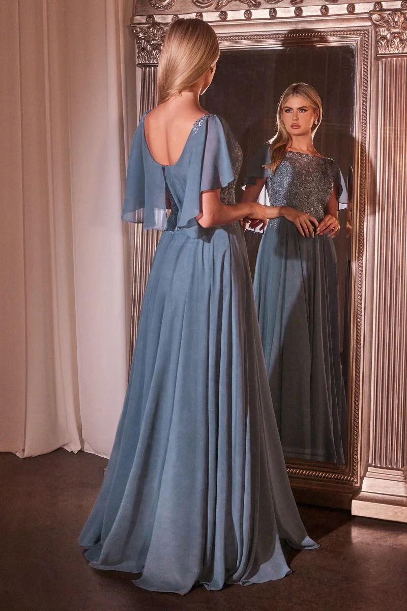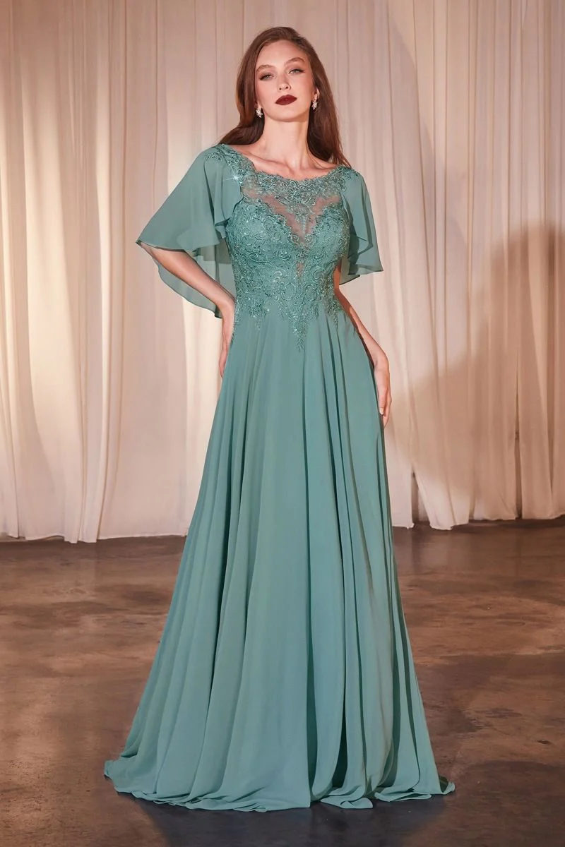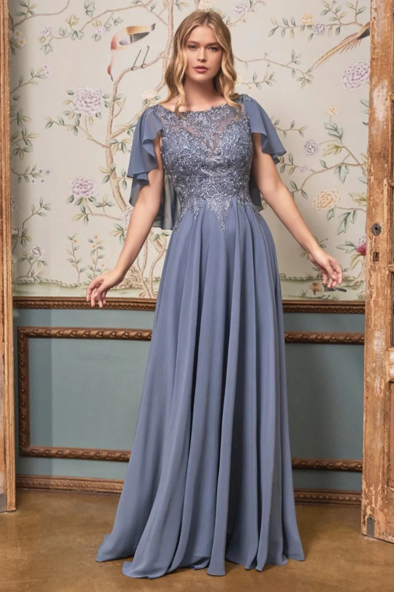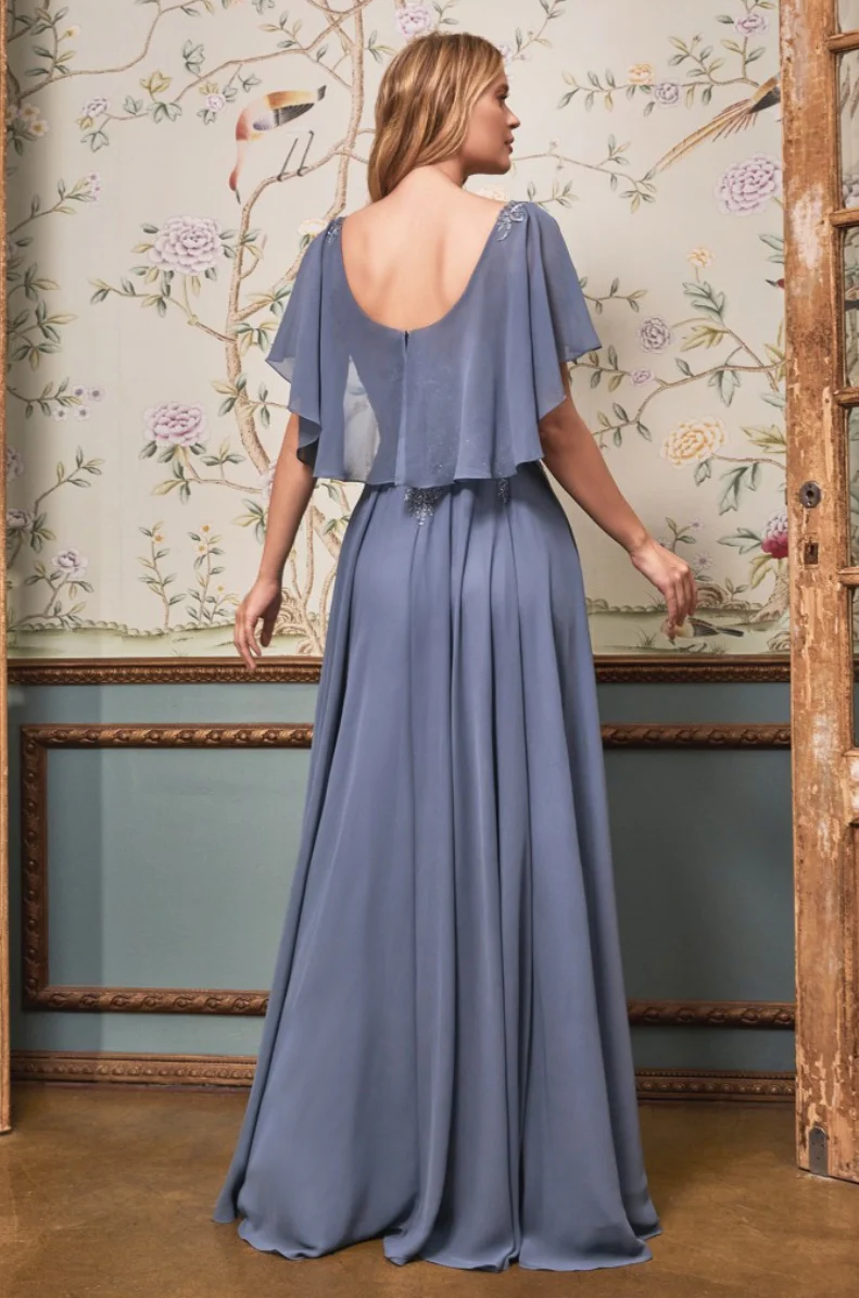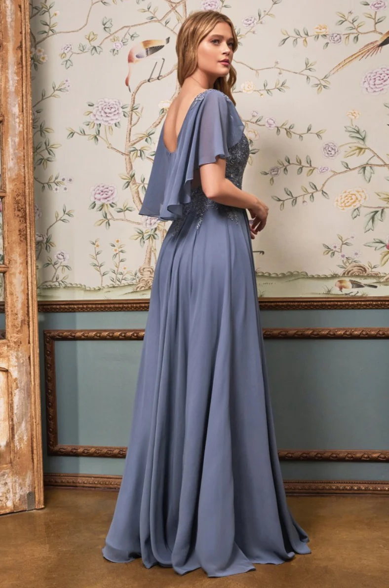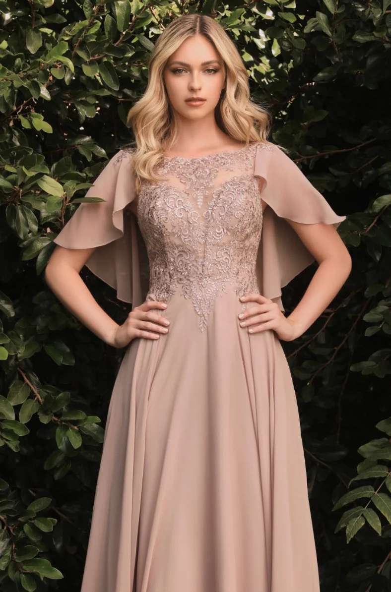 A-Line chiffon gown with caplet.