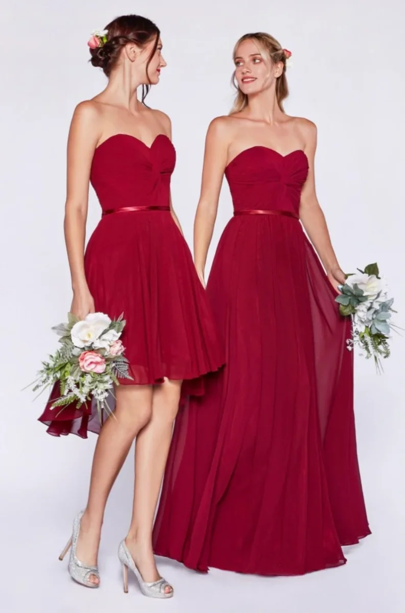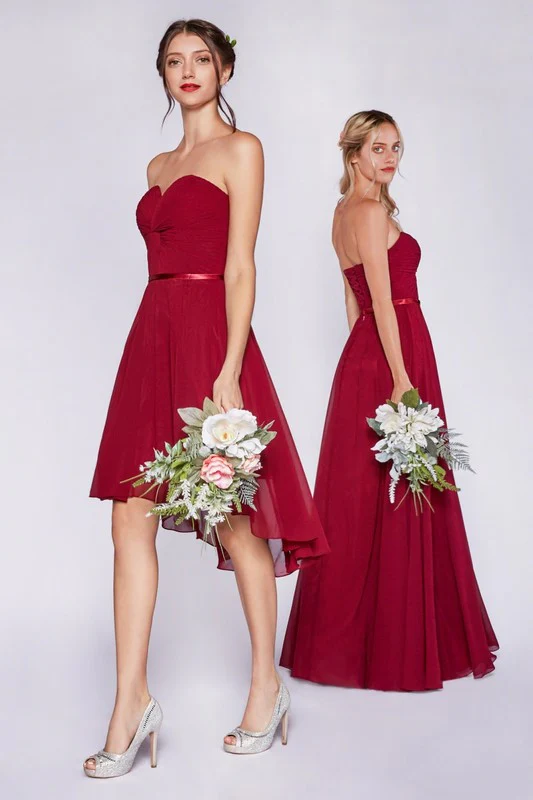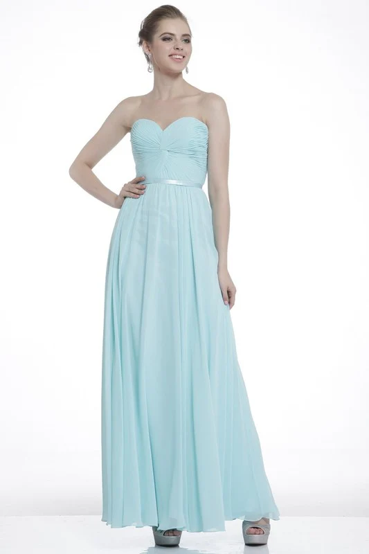 Strapless chiffon a-line dress with gathered bodice and sweetheart neckline.