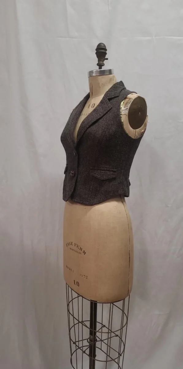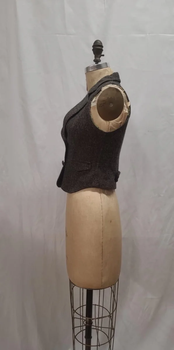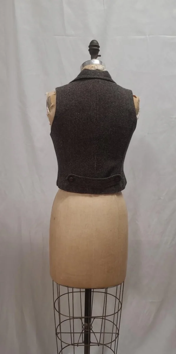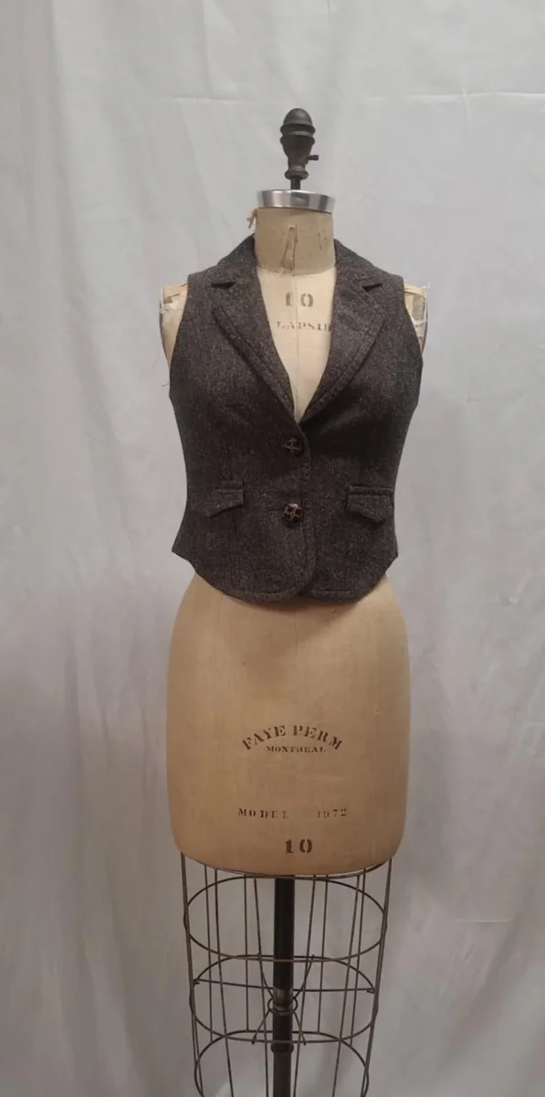 Gilet brun chambray, 2 poches à rabat à la taille. De la marque BEDO FEMME, vintage. Coupe cintrée. S’attache avec 2 boutons au devant. Joli détail au dos, style ceinture avec 2 boutons. Grandeur 10 Épaules 12 po Poitrine 34 po Taille 30 po Longueur 20 po 78 % acrylique / 22 % coton (Doublure […]