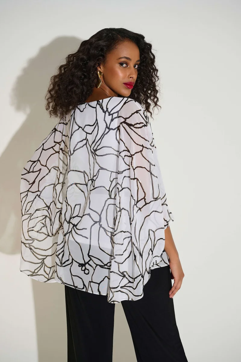 D’un chic sans effort, ce haut au style poncho allie mousseline fluide, accents de satin noir et imprimé floral métallisé saisissant pour une allure à la fois moderne et sophistiquée.