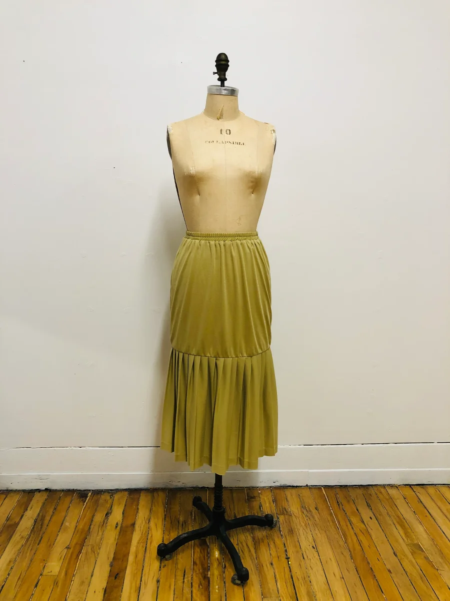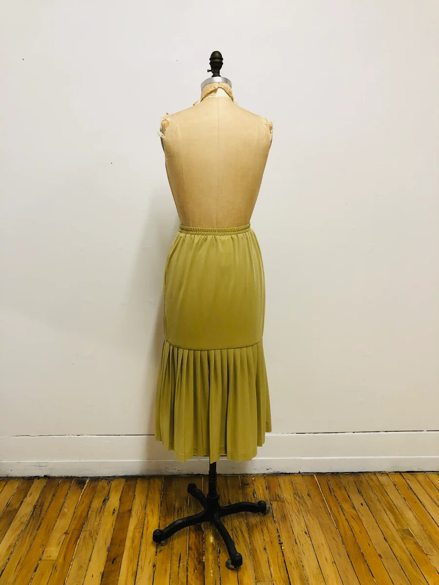 Jupe midi à taille élastique avec une lisière de plis souples au bas. De couleur beige. Taille haute. De la marque montréalaise vintage Cher Cher. En parfait état vintage. Peut être porté avec sa tunique assortie pour un beau look années 1980 ! Grandeur 10 (Fit XS) Taille 23 po Hanches 32 po Longueur 31 […]