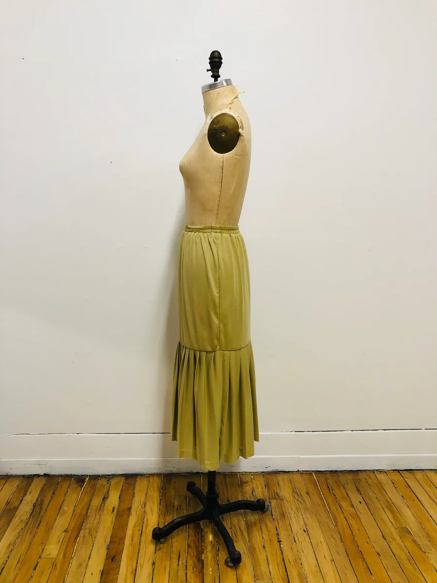 Jupe midi à taille élastique avec une lisière de plis souples au bas. De couleur beige. Taille haute. De la marque montréalaise vintage Cher Cher. En parfait état vintage. Peut être porté avec sa tunique assortie pour un beau look années 1980 !