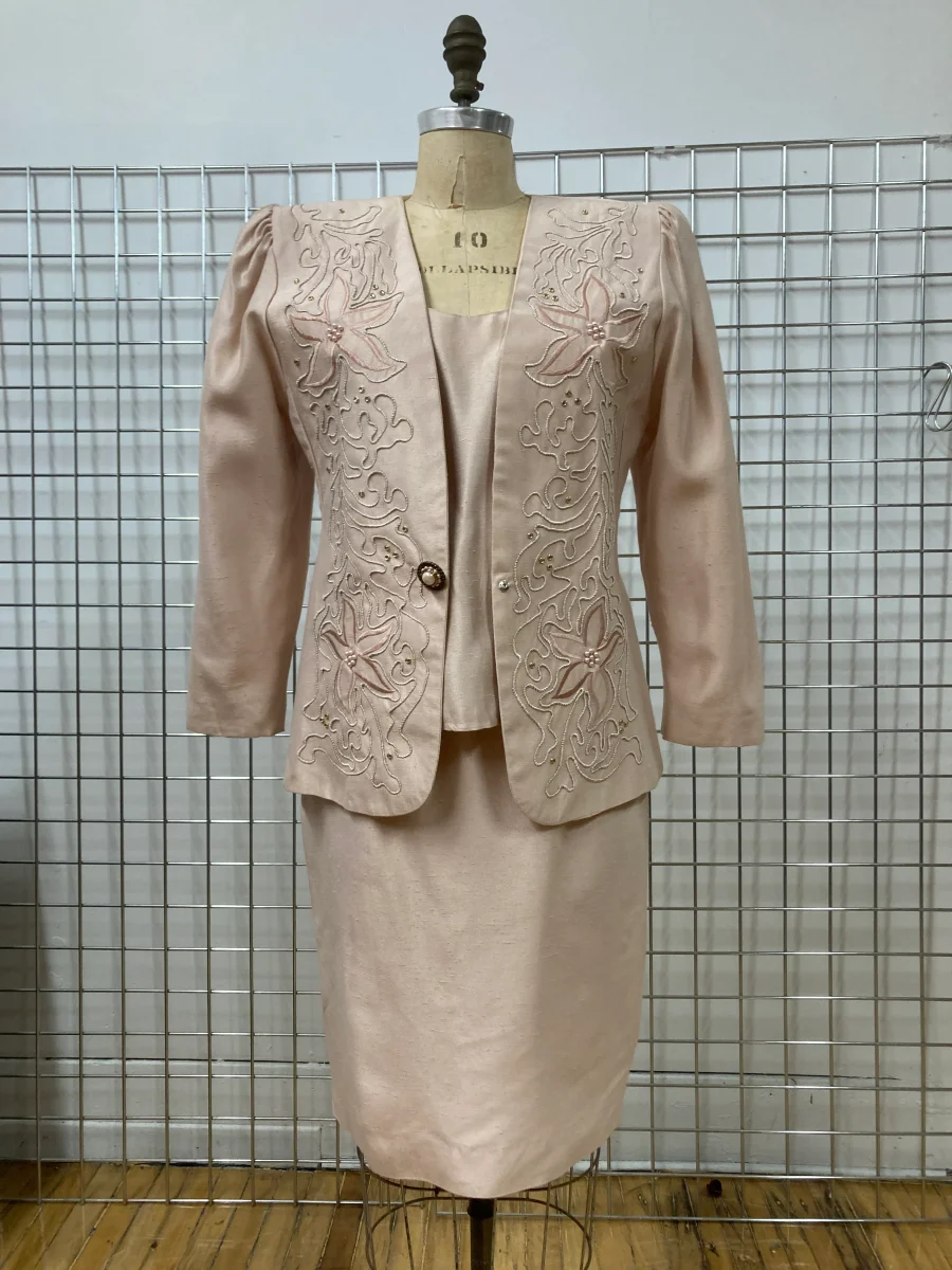 Jolie jupe tailleur rose pâle de la marque vintage AFFLUENCE. Taille légèrement élastique. S’attache avec une fermeture éclair au dos.